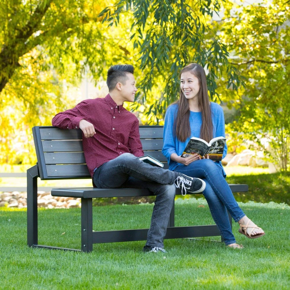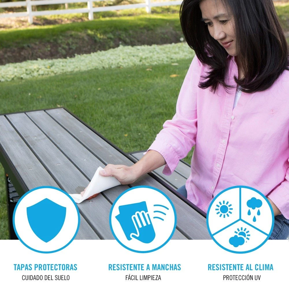 Banco de jardín convertible en mesa LIFETIME. Este banco es ideal para colocar en el jardín, mide 141x36x48 cm, está fabricado con material de poliestireno de alta densidad, con protección UV y repelente al agua, su diseño simula la madera en color gris pero con la facilidad de no tener que pintarlo ni barnizarlo cada año. El respaldo de este cómodo asiento es abatible ideal para usar como mesa y preparar un delicioso picnic.