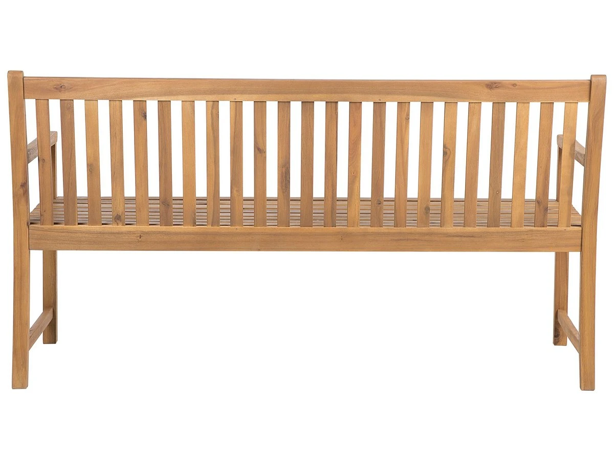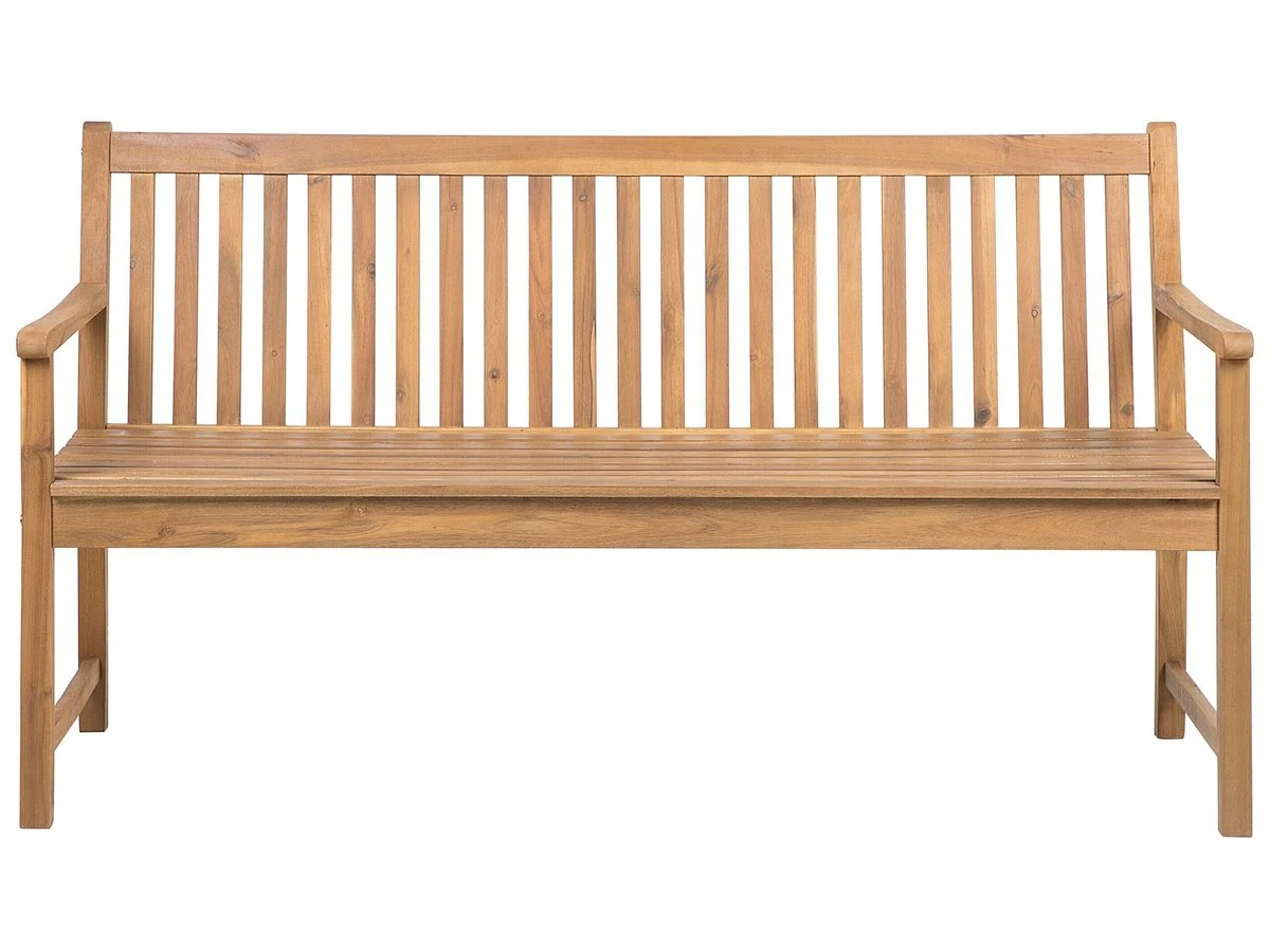 Banco de jardín . Añade modernidad a tu zona exterior con este banco de estilo rústico. Está fabricado a partir de madera de acacia duradera y de alta calidad. Tiene una capacidad para 3 personas. El cojín de asiento ofrece la máxima comodidad. Detalles: Tipo de Producto: Banco Estilo: Rústico Color: Madera clara Tipo de material: Madera maciza Material principal: Madera de acacia con certificado FSC® Acabado: Aceitado Dimensiones: Altura del apoyabrazos: 20 cm Profundidad: 61 cm Altura del asiento: 45 cm Ancho: 160 cm Altura: 88 cm Superficie del asiento: 152×54 cm Peso: 19 kg Capacidad de peso: 480 kg La oferta incluye: 1 x Banco Ventajas: Ancha superficie del asiento, Perfecto para todo tipo de exterior, No requiere mantenimiento regular, Materiales de la más alta calidad, Ideal para uso en interiores y exteriores Información de montaje: Requiere montaje completo. 20-40 min. Información adicional: El producto viene con un libro de cuidados detallado para ayudarte a mantener tus muebles en las mejores condiciones durante muchos años. Consulta estos consejos para garantizar el mantenimiento adecuado de tus muebles nuevos – encontrarás las instrucciones de mantenimiento junto con el manual de montaje. Texto de resistencia: Gracias a su resistencia al agua, puedes utilizar el producto al aire libre y dejarlo a la intemperie durante lluvias ligeras. Si no es posible guardarlo en un lugar cerrado y protegido, recomendamos utilizar una funda protectora. La exposición prolongada a la humedad puede provocar daños en el mueble. Resistencia: Agua ligera / humedad Consejos de mantenimiento: Madera de acacia: 1.Durante el invierno o en condiciones climáticas adversas, utilice una funda protectora o guarde los muebles en el interior 2.Los muebles con acabado de aceite deben volverse a engrasar antes de ponerlos en uso y al menos una vez al año, especialmente en el clima húmedo 3.Limpiar con un limpiador suave y un paño suave en la dirección de la veta. Secar con un paño inmediatamente después de limpiar.