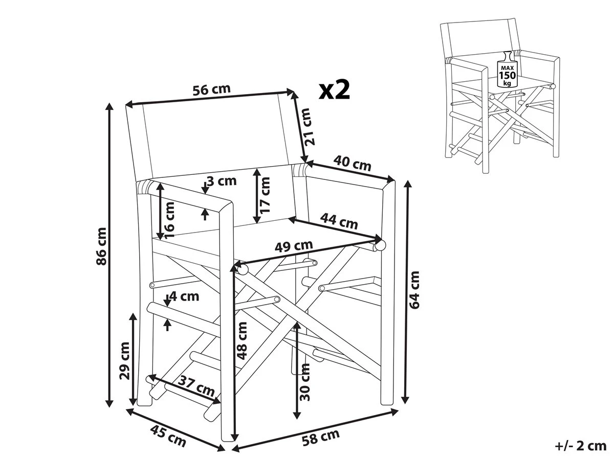 Conjunto de 2 sillas de balcón de madera clara. Aporta a tu espacio al aire libre un estilo decorativo que imite un plató de TV con este conjunto de 2 sillas de balcón. También puedes utilizarlas en tu jardín, patio o sala de estar. La estructura de madera de bambú y las eslingas de poliéster, resistentes a los rayos UV, aportan comodidad y estabilidad. Las sillas son plegables, lo que facilita el transporte y el almacenamiento. Detalles: Tipo de Producto: Silla de jardín Estilo: Boho Color: Madera clara Tonalidad: Blanco crema Tipo de material: Madera maciza Material principal: Madera de bambú Material adicional: Poliéster Material de las patas: Madera maciza Material del asiento: Tejido Composición del Material: 100% Poliéster Apoyabrazo: Sí Acabado: Natural Plegable: Sí Apilable: No Dimensiones: Altura del apoyabrazos: 64 cm Profundidad: 45 cm Altura del asiento: 48 cm Ancho: 58 cm Altura: 86 cm Superficie del asiento: 49×44 cm Peso: 6 kg Capacidad de peso: 150 kg La oferta incluye: 2 x Silla Ventajas: Estilo retro, Combina con cualquier estilo de interior, Solida estructura, Ideal para uso en interiores y exteriores, Resistencia UV 6 (ISO 105-B02, Plegable, ahorra espacio Información de montaje: No requiere montaje Información adicional: Ten en cuenta que el producto es sensible a condiciones climáticas adversas, por lo que, cuando no esté en uso, debe ser almacenado en el interior o en un lugar cubierto. Texto de resistencia: El producto está hecho con tela resistente a los rayos UV, lo que significa que se puede usar bajo la luz del sol sin preocuparse por la pérdida de color. En cualquier caso, es recomendable colocar los muebles debajo de una cubierta impermeable cuando no se utilicen, para asegurar su máxima durabilidad. Resistencia: Rayos UV Consejos de mantenimiento: Madera de bambú: 1.Después de limpiar, frota con una esponja. Por último, seca con una toalla y añade a la madera una capa de cera o aceite 2.Trata las zonas enmohecidas de los muebles con aceite de limón 3.Con el paso del tiempo, la suciedad se puede acumular en la madera de bambú. Asegúrate de realizar una limpieza anual a fondo. Utiliza un cepillo suave y agua tibia con jabón neutro 4.Antes del inicio o final de la temporada, pon un poco de sellador. Solo en lugares con sombra, que no estén ni húmedos ni mojados. Si las condiciones climatológicas son adversas, usa una funda protectora o guarda el mueble en el interior. Poliéster: 1.No secar en secadora ni planchar 2.Lavar a mano únicamente, usar agua fría y un detergente suave 3.Cuando no esté en uso, manténgalo en un lugar limpio y seco para protegerlo de las condiciones atmosféricas.