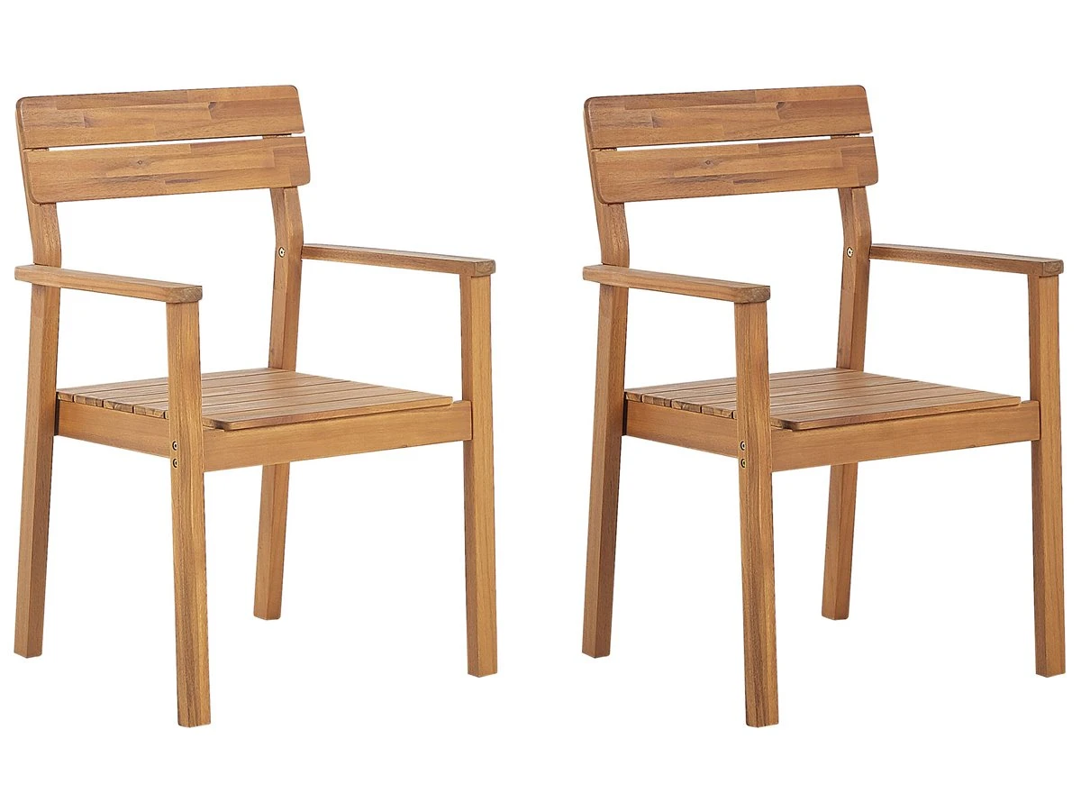 Juego de sillas de madera. Añade a tu exterior este conjunto de 2 sillas de jardín. Está fabricado a partir de madera de acacia resistente y duradera. El diseño clásico con reposabrazos combina bien con una mesa a juego. Ideal para cualquier jardín, patio o terraza. Detalles: Tipo de Producto: Silla de jardín Estilo: Rústico Color: Madera clara Tipo de material: Madera maciza Material principal: Madera de acacia Material de las patas: Madera maciza Material del asiento: Madera maciza Apoyabrazo: Sí Acabado: Aceitado Plegable: No Apilable: No Dimensiones: Altura del apoyabrazos: 63 cm Profundidad: 56 cm Altura del asiento: 44 cm Ancho: 60 cm Altura: 88 cm Superficie del asiento: 42×51 cm Peso: 7 kg Capacidad de peso: 160 kg La oferta incluye: 2 x Silla Ventajas: Cómodos apoyabrazos, Los nudos y vetas de madera natural hacen que cada pieza sea única, Diseño atemporal, Fabricación sólida y precisa, Muy fácil de conservar Información de montaje: Requiere montaje completo. 20-40 min. Información adicional: El producto viene con un libro de cuidados detallado para ayudarte a mantener tus muebles en las mejores condiciones durante muchos años. Consulta estos consejos para garantizar el mantenimiento adecuado de tus muebles nuevos – encontrarás las instrucciones de mantenimiento junto con el manual de montaje. Texto de resistencia: Gracias a su resistencia al agua, puedes utilizar el producto al aire libre y dejarlo a la intemperie durante lluvias ligeras. Si no es posible guardarlo en un lugar cerrado y protegido, recomendamos utilizar una funda protectora. La exposición prolongada a la humedad puede provocar daños en el mueble. Resistencia: Agua ligera / humedad Consejos de mantenimiento: Madera de acacia: 1.Durante el invierno o en condiciones climáticas adversas, utilice una funda protectora o guarde los muebles en el interior 2.Los muebles con acabado de aceite deben volverse a engrasar antes de ponerlos en uso y al menos una vez al año, especialmente en el clima húmedo 3.Limpiar con un limpiador suave y un paño suave en la dirección de la veta. Secar con un paño inmediatamente después de limpiar.