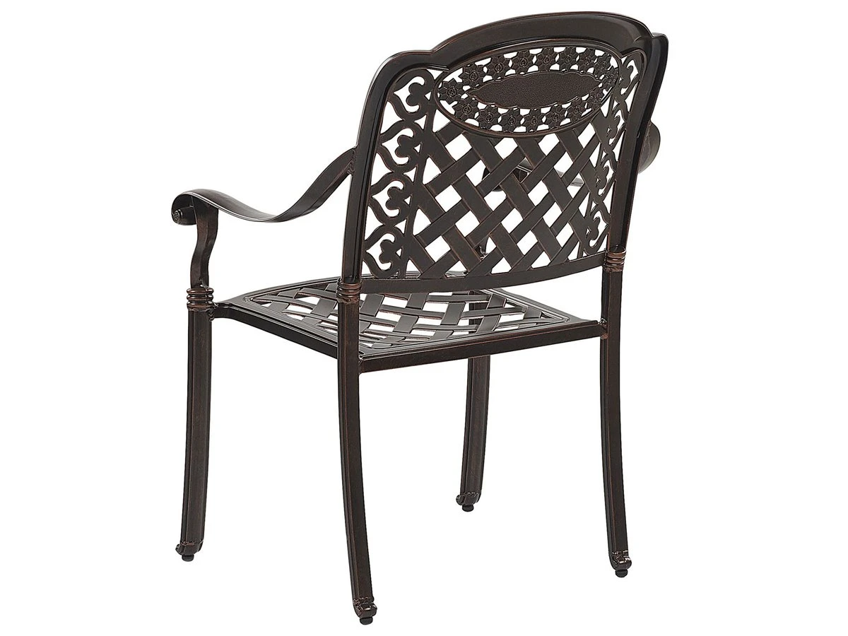 Conjunto de sillas de jardín estilo vintage. Aprovecha al máximo los cálidos días de verano y disfruta de la máxima comodidad gracias a este conjunto de sillas. Hechas de aluminio robusto, embellecen cada terraza o balcón con un elegante acento vintage. Las sillas cuentan con hermosos diseños y detalles, ofreciendo un asiento suave gracias a los cojines generosamente acolchados. Configúralas con una mesa complementaria y disfruta de un lugar perfecto para cenar al aire libre. Detalles: Tipo de Producto: Silla de jardín Estilo: Retro Color: Marrón Tonalidad: Marrón oscuro Tipo de material: Metal Material principal: Aluminio Material adicional: Poliéster Material de las patas: Metal Material del asiento: Tejido Composición del Material: 100% Poliéster Apoyabrazo: Sí Acabado: Pulido Plegable: No Densidad de espuma del asiento: 28 kg/m3 Apilable: Sí Dimensiones: Altura del apoyabrazos: 19 cm Profundidad: 64 cm Espesor del asiento: 5 cm Altura del asiento: 44 cm Ancho: 53 cm Altura: 92 cm Superficie del asiento: 45×45 cm Peso: 8 kg Capacidad de peso: 150 kg La oferta incluye: 4 x Silla, 4 x Cojín del asiento Ventajas: Las tiras ofrecen una fijación segura, Ancha superficie del asiento, Pieza muy llamativa, Diseño tradicional con un toque moderno, Apariencia elegante, Detalles perfectos, Resistencia UV 4 (ISO 105-B05 Información de montaje: No requiere montaje Texto de resistencia: El producto es resistente al agua, lo que significa que no se dañará expuesto a la lluvia o en contacto con otros líquidos. Puede dejarlo al aire libre incluso durante fuertes lluvias o humedad. Durante la temporada de invierno es recomendable almacenar el producto en el interior o bajo una cubierta impermeable. Resistencia: Agua Consejos de mantenimiento: Aluminio: 1.Fuera de temporada, utilice una funda protectora o guarde los muebles en un lugar fresco y seco 2.Limpiar con agua jabonosa y detergentes suaves. Quitar el polvo con un paño suave. Poliéster: 1.Cuando no esté en uso, manténgalo en un lugar limpio y seco para protegerlo de las condiciones atmosféricas 2.Aspire con un accesorio adecuado 3.Limpiar con champú seco y una esponja húmeda o un limpiador suave.