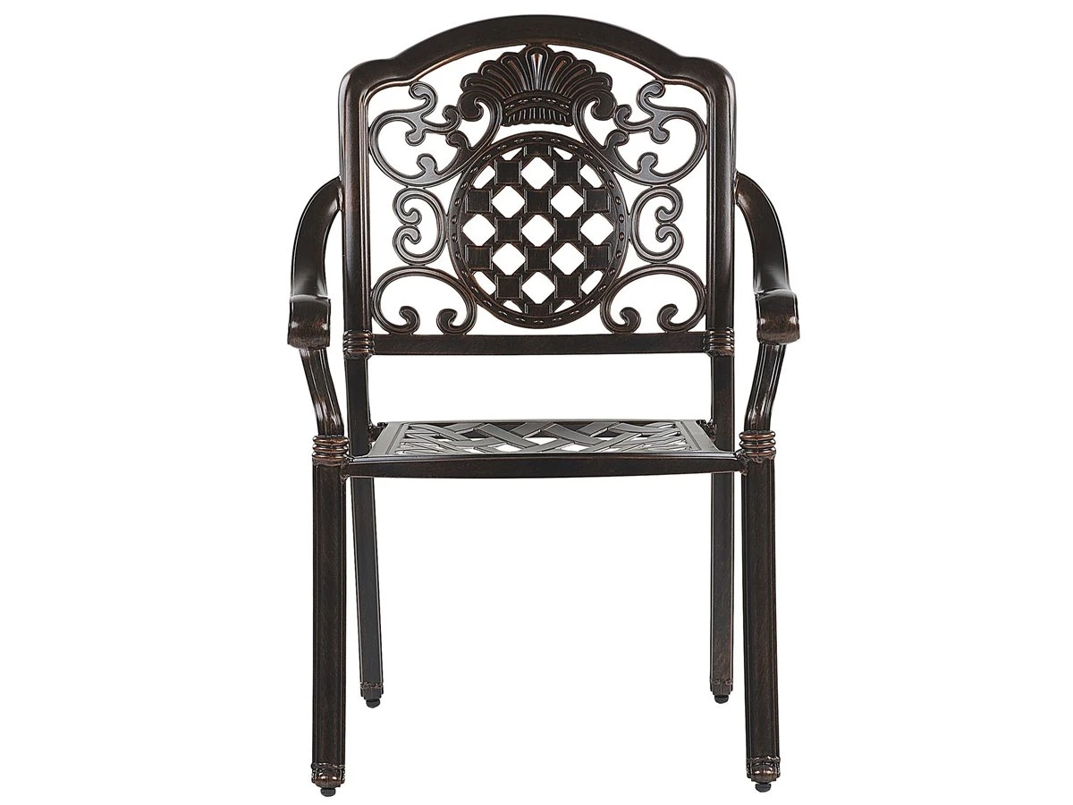 Conjunto de 4 sillas estilo retro. Este juego de sillas al aire libre funcionará perfectamente tanto en un balcón como en un jardín. El diseño llamativo y los detalles precisos le dan un aspecto elegante, mientras que los cojines gruesos y acolchados garantizan la máxima comodidad al sentarse. Las sillas están hechas de aluminio de alta calidad, extremadamente duradero y fácil de cuidar, lo que garantiza que los muebles durarán muchos años. Detalles: Tipo de Producto: Silla de jardín Estilo: Retro Color: Marrón Tonalidad: Marrón oscuro Tipo de material: Metal Material principal: Aluminio Material adicional: Poliéster Material de las patas: Metal Material del asiento: Tejido Composición del Material: 100% Poliéster Apoyabrazo: Sí Acabado: Pulido Plegable: No Densidad de espuma del asiento: 28 kg/m3 Apilable: Sí Dimensiones: Altura del apoyabrazos: 20 cm Profundidad: 53 cm Espesor del asiento: 5 cm Altura del asiento: 45 cm Ancho: 69 cm Altura: 93 cm Superficie del asiento: 46×43 cm Peso: 8 kg Capacidad de peso: 150 kg La oferta incluye: 4 x Silla, 4 x Cojín del asiento Ventajas: Ancha superficie del asiento, Diseño tradicional con un toque moderno, Robusto marco resistente a la corrosión, Resistencia UV 4 (ISO 105-B05, Fundas de cojines con costuras ocultas y cremalleras Información de montaje: No requiere montaje Información adicional: El efecto desgastado o las manchas visibles son intencionales y no se consideran un defecto. Texto de resistencia: El producto es resistente al agua, lo que significa que no se dañará expuesto a la lluvia o en contacto con otros líquidos. Puede dejarlo al aire libre incluso durante fuertes lluvias o humedad. Durante la temporada de invierno es recomendable almacenar el producto en el interior o bajo una cubierta impermeable. Resistencia: Agua Consejos de mantenimiento: Aluminio: 1.Fuera de temporada, utilice una funda protectora o guarde los muebles en un lugar fresco y seco 2.Limpiar con agua jabonosa y detergentes suaves. Quitar el polvo con un paño suave. Poliéster: 1.Cuando no esté en uso, manténgalo en un lugar limpio y seco para protegerlo de las condiciones atmosféricas 2.Aspire con un accesorio adecuado 3.Limpiar con champú seco y una esponja húmeda o un limpiador suave.