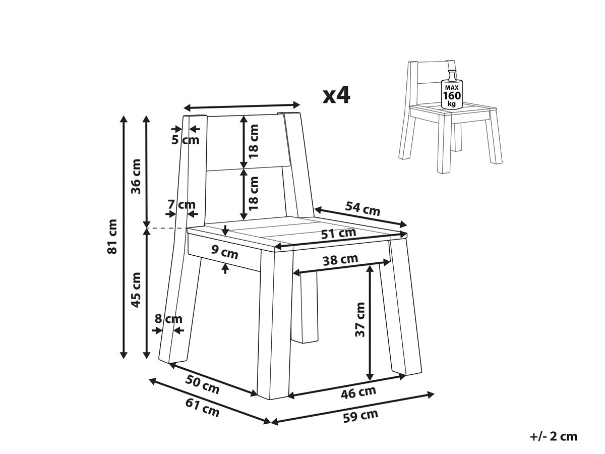 Juego de sillas de jardín. Decora tu exterior con este conjunto de 4 sillas de jardín de inspiración moderna. Están fabricadas a partir de madera de acacia de alta calidad. Las líneas limpias combinan bien con una gran variedad de estilos de decoración. Pueden ser utilizadas en interiores y exteriores. Detalles: Tipo de Producto: Silla de jardín Estilo: Tradicional Color: Madera clara Tipo de material: Madera maciza Material principal: Madera de acacia Material de las patas: Madera maciza Material del asiento: Madera maciza Apoyabrazo: No Acabado: Aceitado Plegable: No Apilable: No Dimensiones: Profundidad: 61 cm Altura del asiento: 45 cm Ancho: 59 cm Altura: 81 cm Superficie del asiento: 51×54 cm Peso: 15.5 kg Capacidad de peso: 160 kg La oferta incluye: 4 x Silla Ventajas: Asiento extremadamente cómodo, Perfecto para todo tipo de exterior, Materiales de la más alta calidad, No requiere mantenimiento regular, Ideal para uso en interiores y exteriores Información de montaje: Requiere montaje completo. Más de 60 min. Información adicional: Por favor, ten en cuenta que la madera es un producto natural, y cada pieza puede presentar ligeras variaciones. Las diferencias en el color o la textura, como las arrugas u otras características naturales, no se consideran un defecto ni tampoco una base de reclamación, El producto viene con un libro de cuidados detallado para ayudarte a mantener tus muebles en las mejores condiciones durante muchos años. Consulta estos consejos para garantizar el mantenimiento adecuado de tus muebles nuevos – encontrarás las instrucciones de mantenimiento junto con el manual de montaje. Texto de resistencia: Gracias a su resistencia al agua, puedes utilizar el producto al aire libre y dejarlo a la intemperie durante lluvias ligeras. Si no es posible guardarlo en un lugar cerrado y protegido, recomendamos utilizar una funda protectora. La exposición prolongada a la humedad puede provocar daños en el mueble. Resistencia: Agua ligera / humedad Consejos de mantenimiento: Madera de acacia: 1.Limpiar con un limpiador suave y un paño suave en la dirección de la veta. Secar con un paño inmediatamente después de limpiar 2.Durante el invierno o en condiciones climáticas adversas, utilice una funda protectora o guarde los muebles en el interior 3.Los muebles con acabado de aceite deben volverse a engrasar antes de ponerlos en uso y al menos una vez al año, especialmente en el clima húmedo.