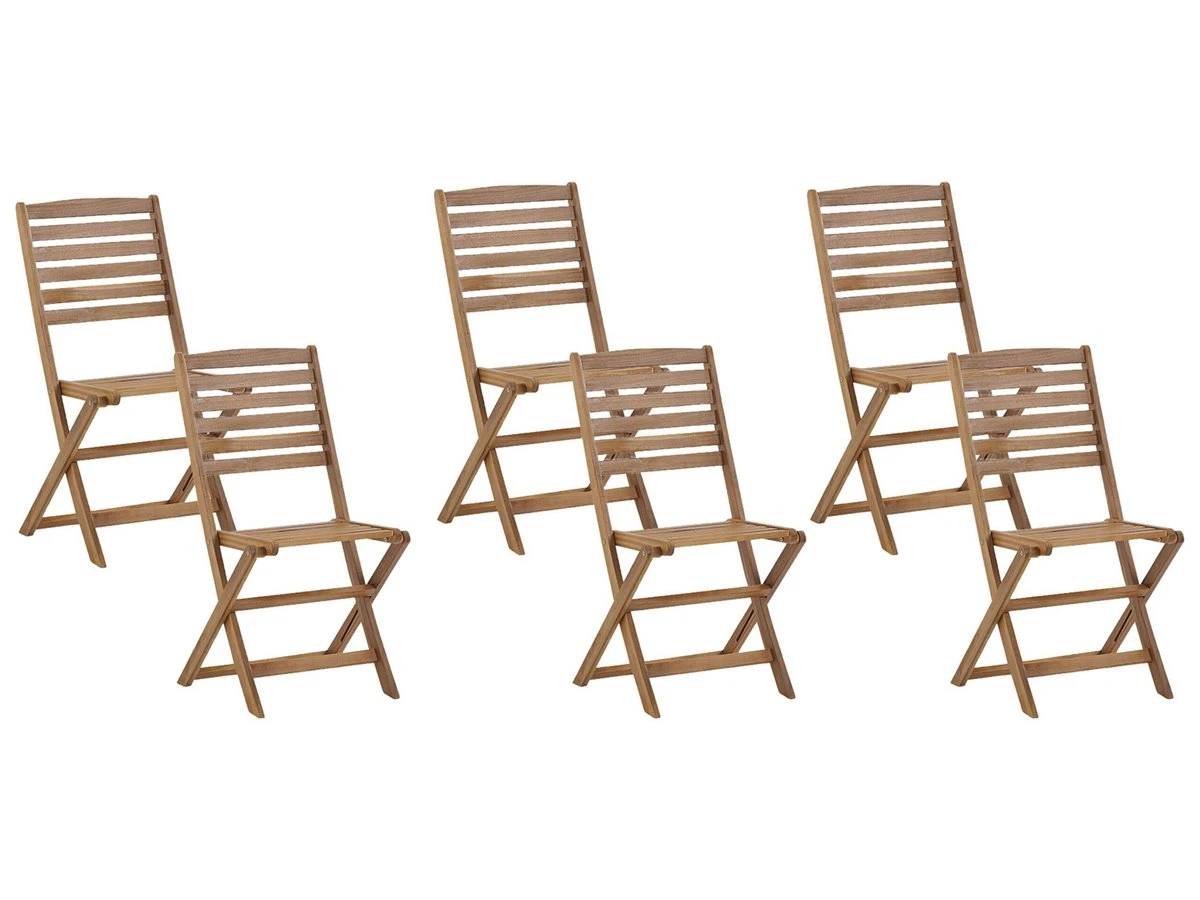 Juego de sillas de jardín para exterior. Uno de los mayores placeres del buen tiempo es cenar al aire libre con tus familiares y amigos. Con este juego de 6 sillas de madera, puedes crear fácilmente un ambiente acogedor en tu jardín o en el patio de tu casa. Las sillas son plegables y, gracias a su bajo peso, puedes moverlas fácilmente de un lugar a otro. El aspecto natural de los muebles de madera de acacia encaja perfectamente en el verde o dentro de tu casa. Detalles: Tipo de Producto: Silla de jardín Estilo: Moderno Color: Madera clara Tipo de material: Madera maciza Material principal: Madera de acacia Material de las patas: Madera maciza Material del asiento: Madera maciza Apoyabrazo: No Acabado: Aceitado Plegable: Sí Apilable: No Dimensiones: Profundidad: 47 cm Altura del asiento: 47 cm Ancho: 52 cm Altura: 91 cm Superficie del asiento: 39×31 cm Peso: 4 kg Capacidad de peso: 100 kg La oferta incluye: 6 x Silla Ventajas: Diseño atemporal, Apariencia moderna y calidad durante muchos años, Fabricación sólida y precisa, Plegable, ahorra espacio, Materiales naturales Información de montaje: No requiere montaje Información adicional: El producto viene con un libro de cuidados detallado para ayudarte a mantener tus muebles en las mejores condiciones durante muchos años. Consulta estos consejos para garantizar el mantenimiento adecuado de tus muebles nuevos – encontrarás las instrucciones de mantenimiento junto con el manual de montaje. Texto de resistencia: Gracias a su resistencia al agua, puedes utilizar el producto al aire libre y dejarlo a la intemperie durante lluvias ligeras. Si no es posible guardarlo en un lugar cerrado y protegido, recomendamos utilizar una funda protectora. La exposición prolongada a la humedad puede provocar daños en el mueble. Resistencia: Agua ligera / humedad Consejos de mantenimiento: Madera de acacia: 1.Durante el invierno o en condiciones climáticas adversas, utilice una funda protectora o guarde los muebles en el interior 2.Los muebles con acabado de aceite deben volverse a engrasar antes de ponerlos en uso y al menos una vez al año, especialmente en el clima húmedo 3.Limpiar con un limpiador suave y un paño suave en la dirección de la veta. Secar con un paño inmediatamente después de limpiar.