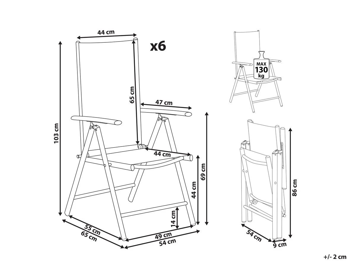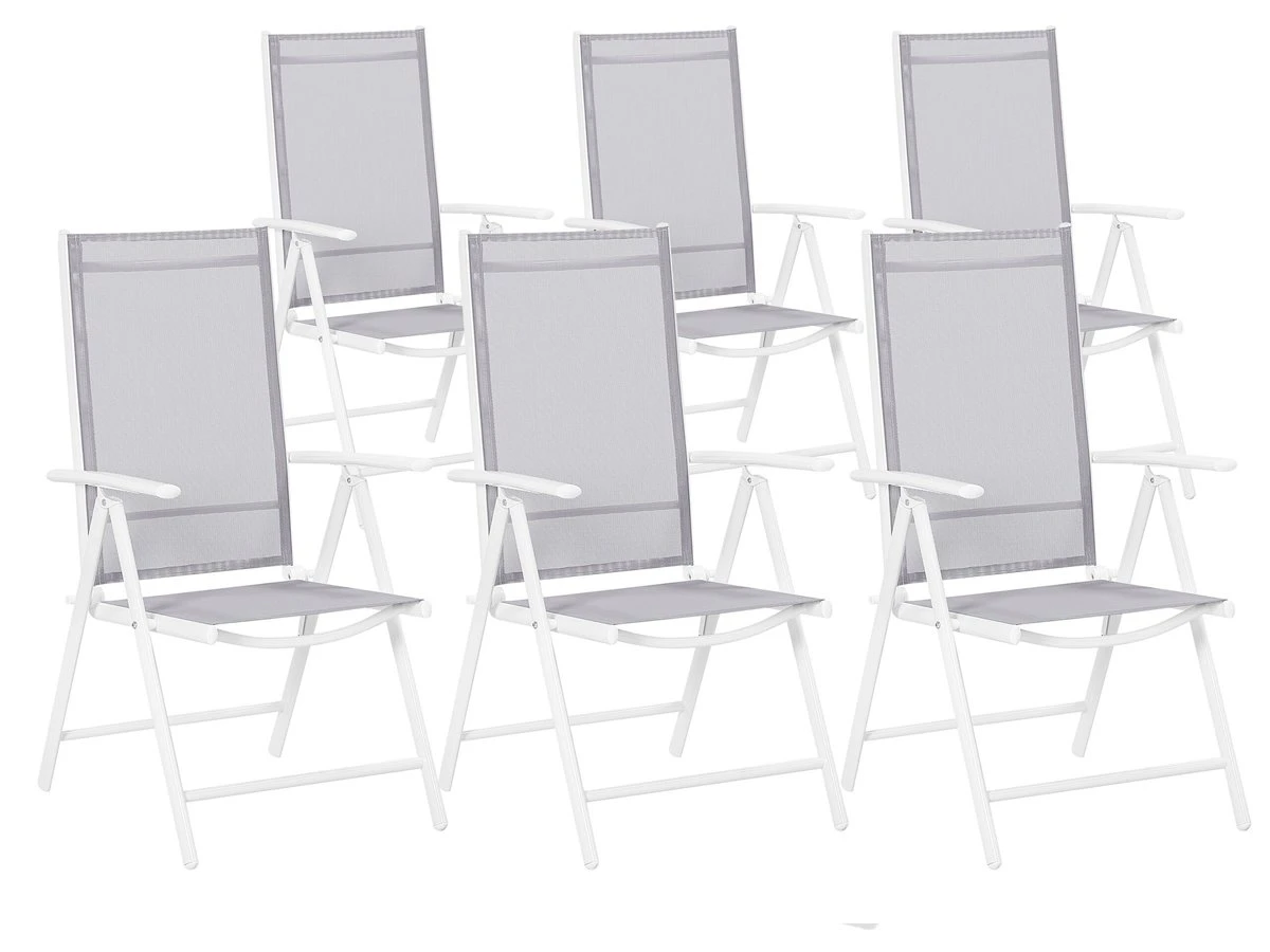 Conjunto de sillas de jardín grises. Elegantes y versátiles, las sillas cuentan con un marco ligero de aluminio y ofrecen asientos muy confortables. El asiento y el respaldo están hechos de un textil trenzado resistente a la intemperie. Las sillas no solo tienen un aspecto elegante, sino que también son muy cómodas gracias al respaldo ajustable en 5 posiciones. El diseño clásico de estas sillas plegables combina perfectamente con cualquier estilo de decoración. Detalles: Tipo de Producto: Silla de jardín Estilo: Industrial Color: Gris Tonalidad: Gris claro Tipo de material: Metal Material principal: Aluminio Material adicional: Poliéster Material de las patas: Metal Material del asiento: Tejido Composición del Material: 90% PVC Apoyabrazo: Sí Acabado: Revestimiento en polvo Plegable: Sí Apilable: No Dimensiones: Altura del apoyabrazos: 67 cm Profundidad: 65 cm Altura del asiento: 43 cm Ancho: 54 cm Altura: 108 cm Superficie del asiento: 44×44 cm Peso: 4 kg Capacidad de peso: 130 kg La oferta incluye: 6 x Silla Ventajas: Respaldo ajustable en 5 posiciones, Muy cómodo, Perfecto para todo tipo de exterior, Resistencia UV, Ideal para uso al aire libre Información de montaje: No requiere montaje Texto de resistencia: El producto es resistente al agua, lo que significa que no se dañará expuesto a la lluvia o en contacto con otros líquidos. Puede dejarlo al aire libre incluso durante fuertes lluvias o humedad. Durante la temporada de invierno es recomendable almacenar el producto en el interior o bajo una cubierta impermeable. Resistencia: Agua Consejos de mantenimiento: Aluminio: 1.Fuera de temporada, utilice una funda protectora o guarde los muebles en un lugar fresco y seco 2.Limpiar con agua jabonosa y detergentes suaves. Quitar el polvo con un paño suave. Poliéster: 1.El material es extremadamente resistente a la intemperie. Sin embargo, se recomienda utilizar una funda protectora para la temporada de invierno o, si es posible, guardar los muebles en un lugar fresco y seco 2.Manténgalo alejado de fuentes de calor, como parrilla o fuego, ya que las chispas pueden causar daños graves. No coloque utensilios calientes directamente sobre la superficie, 3.Limpiar con un limpiador a base de jabón suave y un paño suave