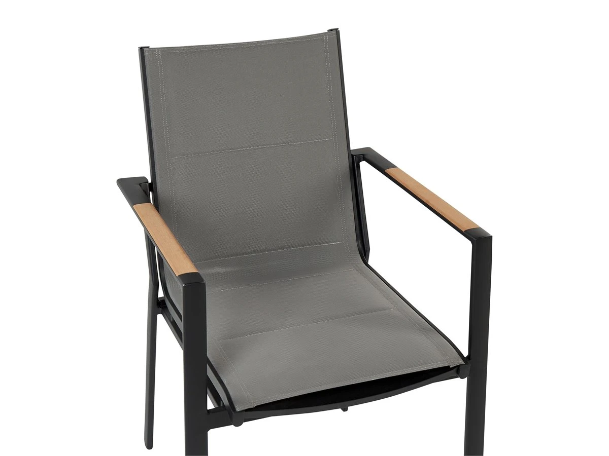 Juego de exterior. Añade a tu zona exterior este conjunto de comedor de diseño moderno. Está fabricado a partir de material duradero y de alta calidad. Las sillas tapizadas y los reposabrazos garantizan la máxima comodidad. La forma geométrica de las patas de la mesa completa el diseño. Utilizable en interiores y exteriores. Detalles: Tipo de Producto: Conjunto de comedor Estilo: Moderno Color: Negro Tipo de material: Material sintético Material principal: Aluminio Material adicional: Cerámica Composición del Material: 100% Poliéster Acabado: Revestimiento en polvo Dimensiones: Dimensiones de la silla: 48x55x90 cm Altura del asiento: 39 cm Dimensiones de la mesa: 110x110x74 cm Peso: 23 kg Capacidad de peso de la silla: 150 kg Capacidad de peso de la mesa: 70 kg La oferta incluye: 1 x Mesa, 4 x Silla Ventajas: Cojines muy cómodos para un confort ideal, Robusto marco resistente a la corrosión, Resistencia UV 5 (ISO 105-B02, Mantenimiento sencillo, Patas con tapas anti-deslizantes, Apilable, ahorra espacio Información de montaje: Requiere montaje de las patas. 20-40 min. Texto de resistencia: Gracias al acabado especial, la superficie del producto es resistente a la oxidación. Esto significa que se puede utilizar en exteriores. Cuando el producto no esté en uso, se recomienda cubrirlo con una cubierta o colocarlo en un lugar seco. Resistencia: Intemperie Consejos de mantenimiento: Aluminio: 1.Fuera de temporada, utilice una funda protectora o guarde los muebles en un lugar fresco y seco 2.Limpiar con agua jabonosa y detergentes suaves. Quitar el polvo con un paño suave. Cerámica: 1.Limpiar con un limpiador suave y un paño suave, secar después 2.El material es resistente a la intemperie, pero durante el invierno se recomienda utilizar una funda protectora o guardar los muebles en el interior. Poliéster: 1.Cuando no esté en uso, manténgalo en un lugar limpio y seco para protegerlo de las condiciones atmosféricas 2.No secar en secadora ni planchar 3.Lavar a mano únicamente, usar agua fría y un detergente suave.