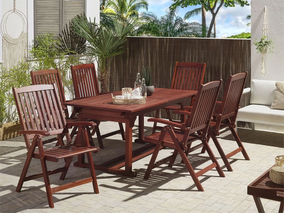 Conjunto de jardín en madera. Mejora la comodidad de tu área al aire libre con este elegante juego de comedor de inspiración rústica. Hecho de madera de acacia de alta calidad en color marrón oscuro, se puede colocar en diferentes entornos. También presenta una alta resistencia a los rayos UV y a la intemperie, lo que garantiza la longevidad a lo largo de los años. Los respaldos reclinables garantizan la máxima comodidad, lo que te permite configurar esta pieza como desees, y una capacidad de plegado te permite almacenar el conjunto cuando no es necesario. Detalles: Tipo de Producto: Conjunto de comedor Estilo: Rústico Color: Madera oscura Tonalidad: Rojo oscuro Tipo de material: Madera maciza Material principal: Madera de acacia Material adicional: Acero Material de la superficie: Madera maciza Acabado: Aceitado Dimensiones: Dimensiones de la silla: 54x69x105 cm Altura del asiento: 44 cm Dimensiones de la mesa: 160/220x90x74 cm Peso: 106 kg Capacidad de peso de la silla: 160 kg Capacidad de peso de la mesa: 75 kg La oferta incluye: 1 x Mesa, 6 x Silla Ventajas: Respaldo ajustable en 6 posiciones, Tablero con agujero para sombrilla, Combina con todo tipo de decoración, Diseño atemporal, Apariencia moderna y calidad durante muchos años, Plegable, ahorra espacio, La mesa extensible proporciona espacio adicional Información de montaje: Requiere montaje parcial. 20-40 min. Información adicional: Para una mayor estabilidad y seguridad de uso, se recomienda verificar 2 semanas después de la instalación que el montaje del producto ha sido realizado de forma correcta. Revisa, al menos una vez cada 3 meses, que los tornillos estén bien apretados. Por favor, ten en cuenta que la madera es un producto natural, y cada pieza puede presentar ligeras variaciones. Las diferencias en el color o la textura, como las arrugas u otras características naturales, no se consideran un defecto ni tampoco una base de reclamación, El producto viene con un libro de cuidados detallado para ayudarte a mantener tus muebles en las mejores condiciones durante muchos años. Consulta estos consejos para garantizar el mantenimiento adecuado de tus muebles nuevos – encontrarás las instrucciones de mantenimiento junto con el manual de montaje. Texto de resistencia: Gracias a su resistencia al agua, puedes utilizar el producto al aire libre y dejarlo a la intemperie durante lluvias ligeras. Si no es posible guardarlo en un lugar cerrado y protegido, recomendamos utilizar una funda protectora. La exposición prolongada a la humedad puede provocar daños en el mueble. Resistencia: Agua ligera / humedad Consejos de mantenimiento: Madera de acacia: 1.Los muebles con acabado de aceite deben volverse a engrasar antes de ponerlos en uso y al menos una vez al año, especialmente en el clima húmedo 2.Limpiar con un limpiador suave y un paño suave en la dirección de la veta. Secar con un paño inmediatamente después de limpiar 3.Durante el invierno o en condiciones climáticas adversas, utilice una funda protectora o guarde los muebles en el interior.