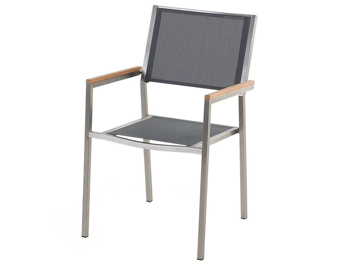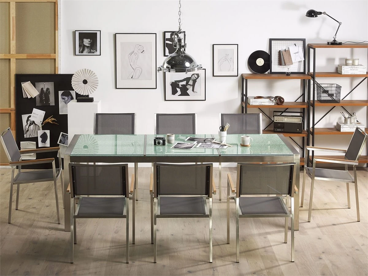 Moderno conjunto de jardín de mesa y 8 sillas. Añade elegancia a tu zona exterior con este conjunto de comedor. Está constituido por una mesa y 8 sillas. Fabricado a partir de acero inoxidable duradero y vidrio templado. Las sillas son resistentes a los rayos UV y apilables, lo que permite ahorrar espacio. Detalles: Tipo de Producto: Conjunto de comedor Estilo: Moderno Color: Gris Tonalidad: Gris oscuro Tipo de material: Vidrio Material principal: Vidrio templado Material adicional: Madera plástica Material de la superficie: Vidrio Composición del Material: 90% PVC Acabado: Brillante Dimensiones: Dimensiones de la silla: 55x58x87 cm Altura del asiento: 44 cm Dimensiones de la mesa: 220x100x74 cm Peso: 189 kg Capacidad de peso de la silla: 160 kg Capacidad de peso de la mesa: 70 kg La oferta incluye: 1 x Mesa, 8 x Silla Ventajas: Confort del asiento óptimo, Diseño atemporal, Perfecto para todo tipo de exterior, Materiales de la más alta calidad, Detalles perfectos, Resistencia UV 4 (ISO 105-B02, Mantenimiento sencillo, Apilable para un almacenaje mejor, Tablero en vidrio templado de seguridad Información de montaje: Requiere montaje parcial. 20-40 min. Información adicional: Las manchas blancas visibles en la mesa después de la lluvia son una característica típica del producto, no un defecto de calidad. El producto viene con un libro de cuidados detallado para ayudarte a mantener tus muebles en las mejores condiciones durante muchos años. Consulta estos consejos para garantizar el mantenimiento adecuado de tus muebles nuevos – encontrarás las instrucciones de mantenimiento junto con el manual de montaje. Texto de resistencia: Gracias a su resistencia al agua, puedes utilizar el producto al aire libre y dejarlo a la intemperie durante lluvias ligeras. Si no es posible guardarlo en un lugar cerrado y protegido, recomendamos utilizar una funda protectora. La exposición prolongada a la humedad puede provocar daños en el mueble. Resistencia: Agua ligera / humedad Consejos de mantenimiento: Vidrio templado: 1.Limpiar con un detergente suave o acondicionador de vidrio con un paño suave. Secar después de limpiar 2.Secar después de la lluvia o la nieve. Durante el invierno, utilice una funda protectora o guarde los muebles en el interior 3.Para evitar rayones, no use un limpiador cremoso. Acero inoxidable: 1.Durante el invierno, utilice una funda protectora o guarde los muebles en el interior 2.Durante la lluvia, se recomienda utilizar una funda protectora 3.Limpiar solo con agentes de limpieza suaves. No utilice limpiadores alcalinos o ácidos 4.Las lluvias ácidas, el agua salada y las tormentas de arena pueden dañar la capa protectora. Material sintético: 1.Limpiar con un limpiador a base de jabón suave y un paño suave, 2.El material es extremadamente resistente a la intemperie. Sin embargo, se recomienda utilizar una funda protectora para la temporada de invierno o, si es posible, guardar los muebles en un lugar fresco y seco 3.Manténgalo alejado de fuentes de calor, como parrilla o fuego, ya que las chispas pueden causar daños graves. No coloque utensilios calientes directamente sobre la superficie