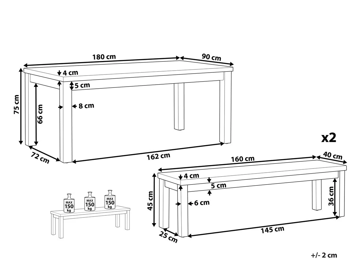 Conjunto de jardín mesa y 2 bancos. Si te gustan el estilo industrial y las reuniones al aire libre con familia o amigos, este conjunto de jardín es perfecto para ti. El set consta de una mesa y 2 bancos, cada pieza está constituida de cemento reforzado combinado con una base de madera. La madera de acacia en acabado natural garantiza durabilidad y ofrece un aspecto clásico, aprovechando su estética natural. Colócalo en un jardín o terraza y disfruta de este juego de comedor para 6 personas. Detalles: Tipo de Producto: Conjunto de comedor Estilo: Industrial Color: Gris Tipo de material: Cemento Material principal: Cemento reforzado con fibra Material adicional: Madera de acacia Material de la superficie: Cemento Acabado: Mate Dimensiones: Dimensiones del banco: 150x40x40 Altura del asiento: 40 cm Dimensiones de la mesa: 180x90x76 cm Peso: 109 kg Capacidad de peso de la mesa: 60 kg La oferta incluye: 1 x Mesa, 2 x Banco Ventajas: Ideal para grandes reuniones con amigos y familiares, Patas estables y resistentes, Colores elegantes y diseño original, Ideal para uso en interiores y exteriores, Fabricación sólida y precisa Información de montaje: Requiere montaje de las patas. 20-40 min. Información adicional: Dependiendo de la humedad del aire, los muebles de concreto pueden tener grietas, agujeros o cambiar de color. Es una característica natural del material y no afecta su calidad. El producto viene con un libro de cuidados detallado para ayudarte a mantener tus muebles en las mejores condiciones durante muchos años. Consulta estos consejos para garantizar el mantenimiento adecuado de tus muebles nuevos – encontrarás las instrucciones de mantenimiento junto con el manual de montaje. Texto de resistencia: El producto es resistente al viento, por lo que no debe volcarse ni perder estabilidad con ráfagas de viento. Resistencia: Agua ligera / humedad Consejos de mantenimiento: Cemento reforzado con fibra: 1.Durante el invierno utilice una funda protectora o guarde los muebles en el interior 2.Para evitar manchas, no utilice detergentes cremosos o detergentes con ácidos o aceites. Madera de acacia: 1.Los muebles con acabado de aceite deben volverse a engrasar antes de ponerlos en uso y al menos una vez al año, especialmente en el clima húmedo 2.Limpiar con un limpiador suave y un paño suave en la dirección de la veta. Secar con un paño inmediatamente después de limpiar 3.Durante el invierno o en condiciones climáticas adversas, utilice una funda protectora o guarde los muebles en el interior.