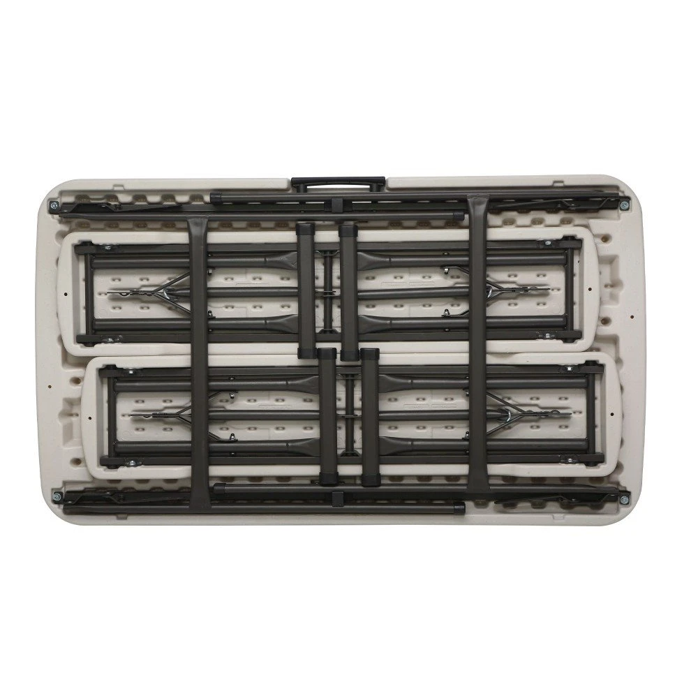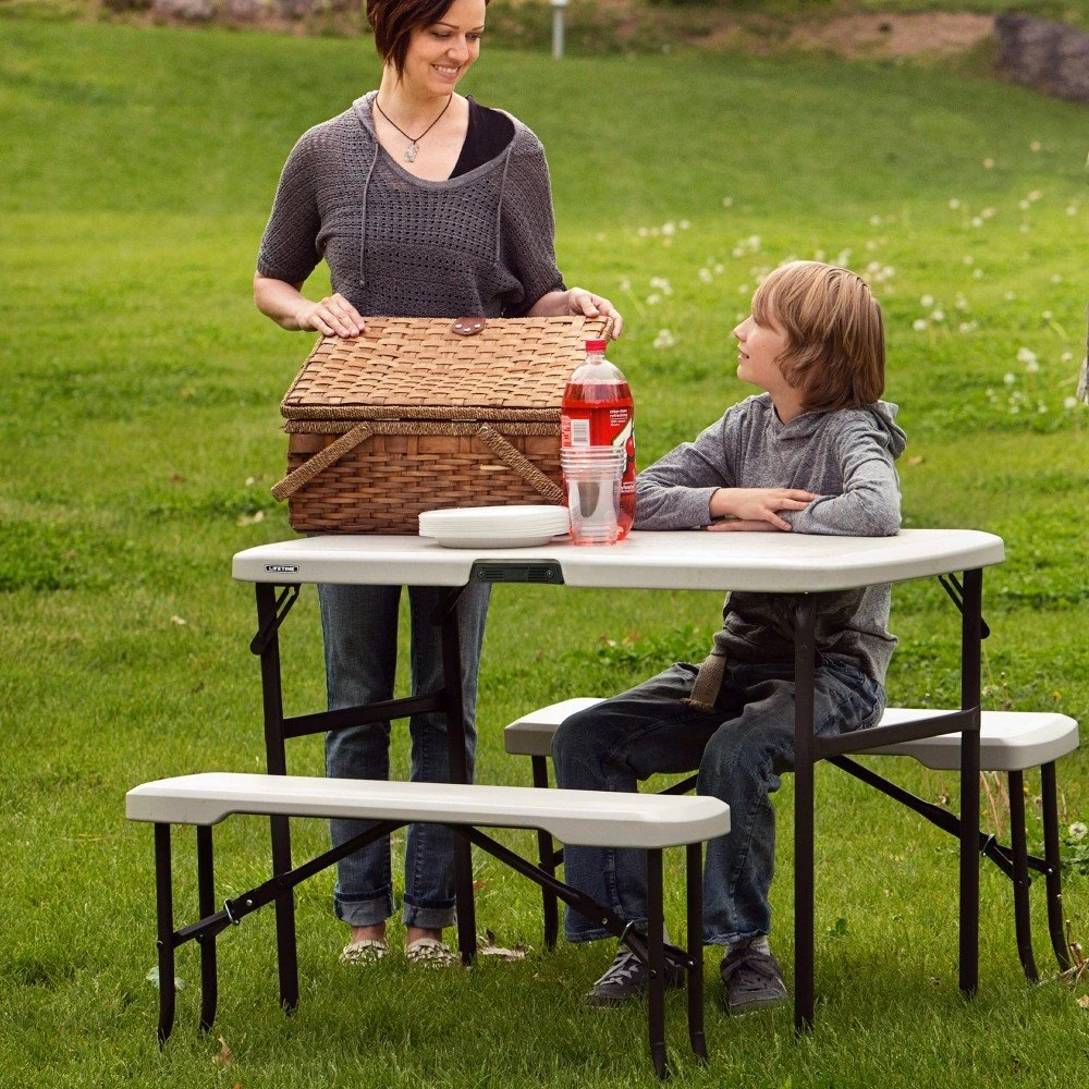 Conjunto de mesa y dos bancos plegables ultrarresistentes LIFETIME. Medidas mesa: 106x61x74 cm, medidas bancos: 94x22x42 cm. Las 3 piezas son independientes y se pliegan por la mitad con asas incorporadas. Superficies de polietileno de alta densidad con estructura de acero galvanizado y protección antióxido y UV. Adecuado para 4 personas. Los bancos se sujetan a la mesa para su transporte.