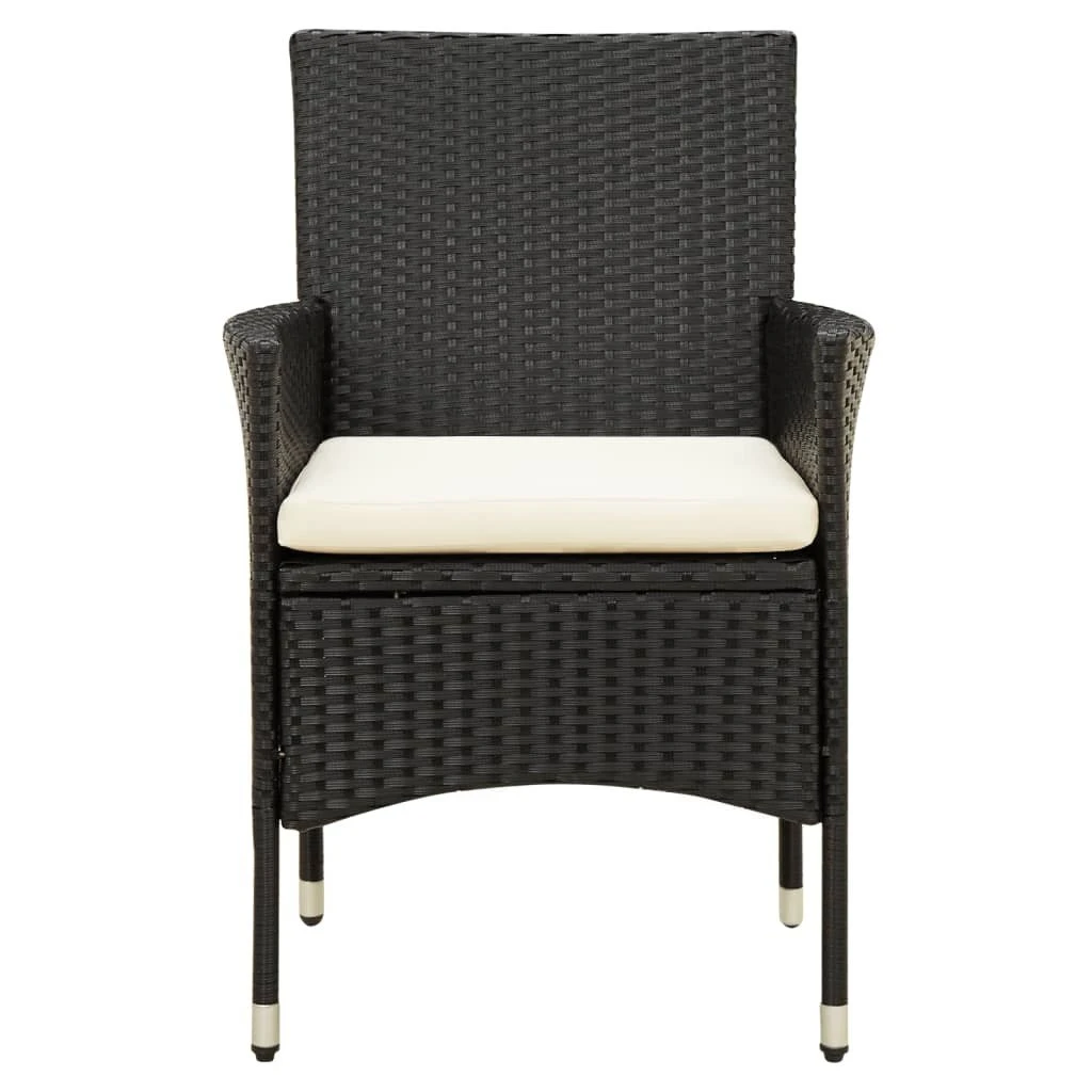 Con un diseño elegante y una estructura de acero duradero, este juego de muebles de comedor es la opción perfecta para tu espacio al aire libre. Este juego de comedor de jardín cuenta con una estructura de acero con recubrimiento en polvo, lo que hace que la mesa y las sillas sean estables y duraderas. Gracias al ratán PE resistente a la intemperie y al agua, el conjunto de muebles de exterior es fácil de limpiar. Los gruesos cojines extraíbles del asiento aumentan la comodidad del asiento y son fáciles de lavar. Nota: Para prolongar la vida útil de los muebles de exterior, te recomendamos que los limpies con regularidad y no los dejes al aire libre sin protección innecesariamente.Limpiar: Usa una solución de jabón suaveAlmacenamiento: Si es posible, guarda el producto en un lugar fresco y seco en el interior. Si el producto se almacena al aire libre, protégelo con una funda impermeable. Limpia y seca el exceso de agua o nieve de las superficies planas después de una lluvia o nevada. Permite la ventilación para evitar daños relacionados con la humedad. Mesa:Color: NegroMaterial: Ratán sintético, acero con recubrimiento en polvo, vidrio templadoDimensiones: 90 x 90 x 75 cm (largo x ancho x altoSilla:Color del ratán sintético: NegroColor de los cojines: Blanco cremaMaterial: Ratán sintético, acero con recubrimiento en polvo, tela (100% poliésterDimensiones: 61 x 60 x 88 cm (ancho x profundo x altoRequiere montaje: SíLa entrega incluye:1 x Mesa2 x Sillas2 x Cojines