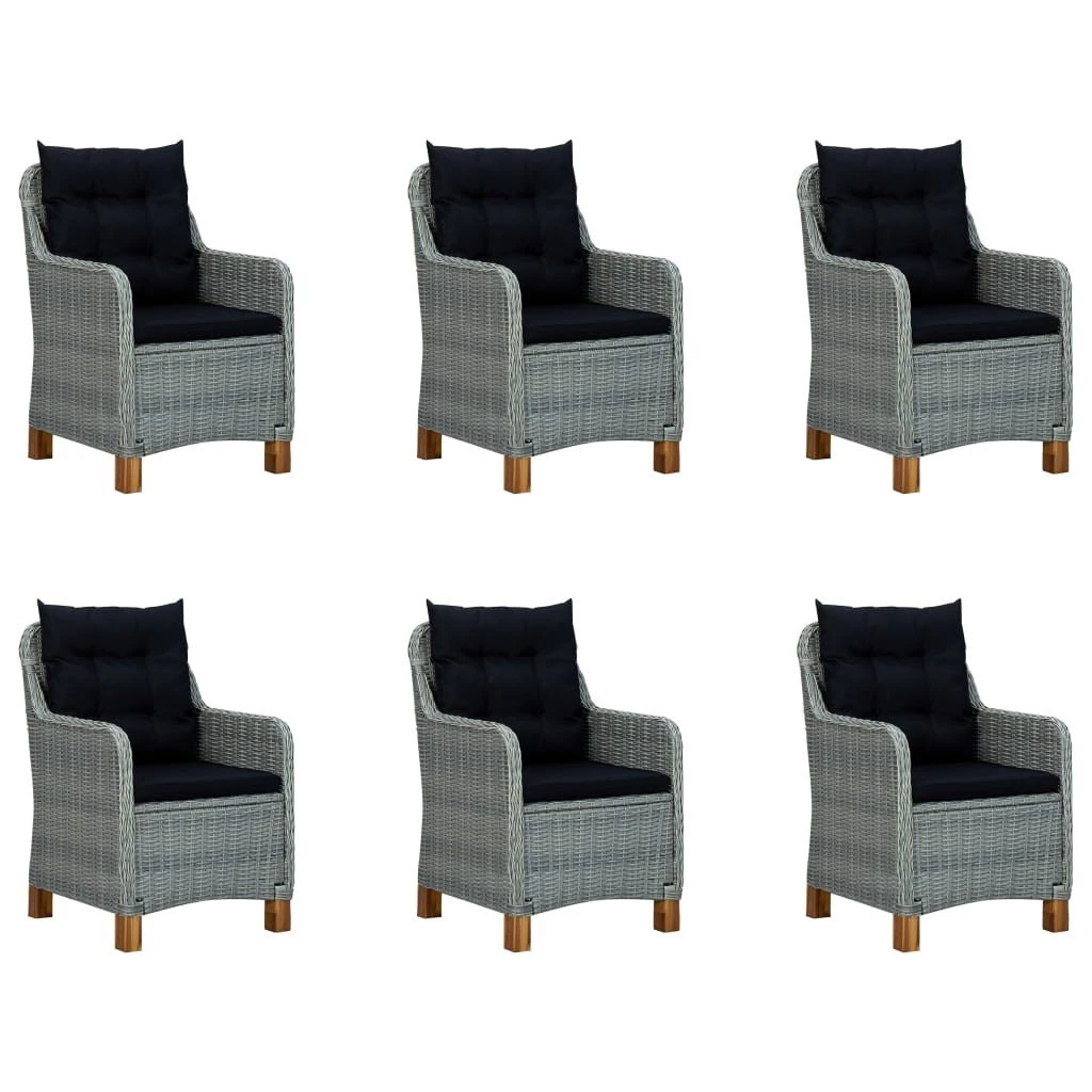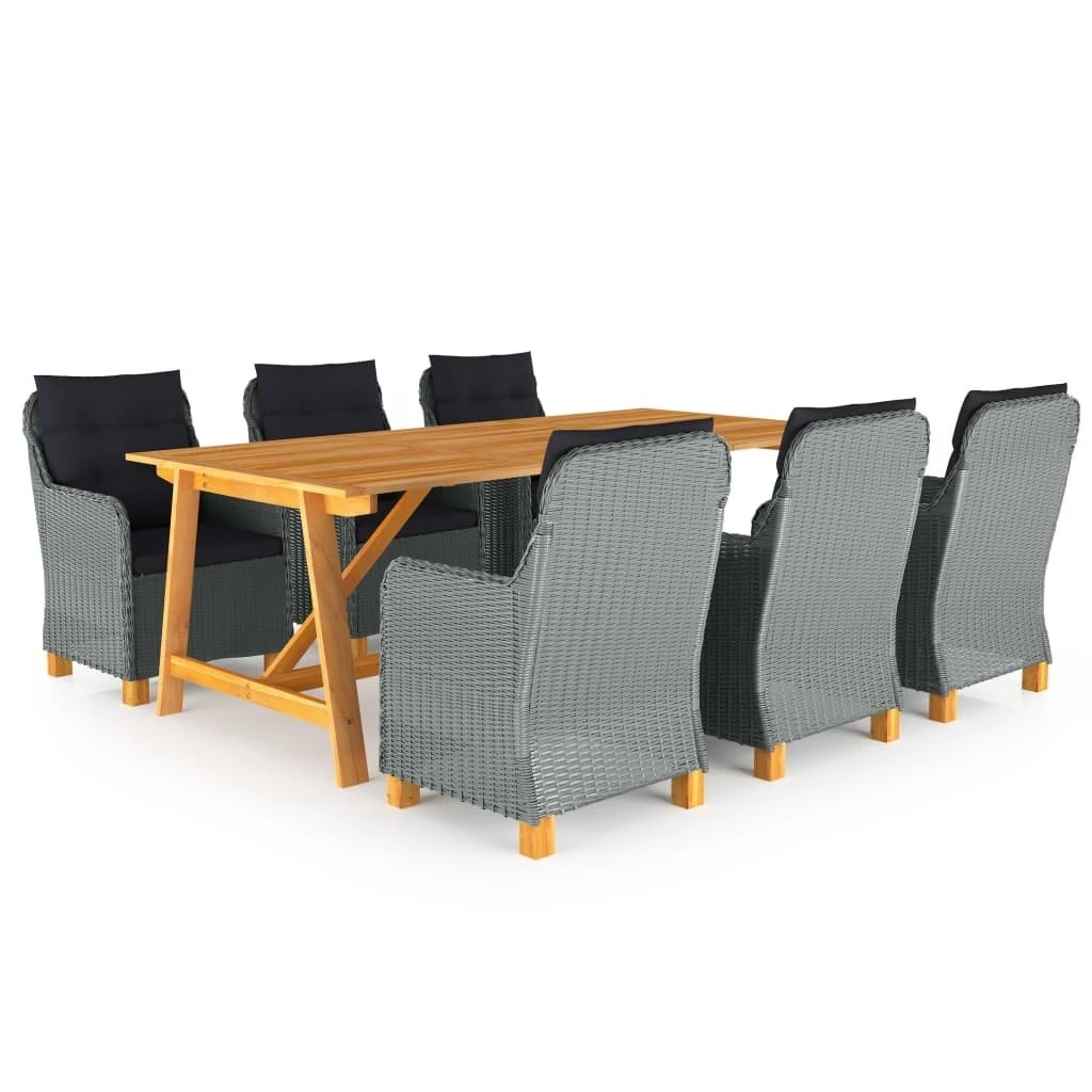 ¡Crea una estética atractiva y cohesionada en el espacio al aire libre de tu casa con este juego de comedor para jardín! La mesa de comedor está hecha de madera maciza de acacia con un acabado al aceite, por lo que es estable, duradera y fácil de mantener. La silla de exterior, con una estructura de acero con recubrimiento en polvo cubierta de ratán sintético redondo, es robusta y fácil de limpiar. Los cojines bien acolchados añaden un plus de comodidad en tu tiempo de descanso. La funda del cojín está equipada con una cremallera, es extraíble y lavable. Además, las patas de madera maciza de acacia refuerza su solidez y estabilidad. Estas sillas de jardín son fáciles de mover gracias a su construcción ligera. Nota importante: Recomendamos cubrir el set de comedor en caso de lluvia, nieve y heladas para que sea más duradero. Mesa:Material: Madera maciza de acacia con acabado de aceite Dimensiones: 206 x 100 x 74 cm (largo x ancho x altoSilla:Color: Gris claroColor del cojín: NegroMaterial: Ratán PE redondo, madera maciza de acacia, acero con recubrimiento en polvoMaterial del cojín: Funda 100% poliéster con relleno de espumaDimensiones totales: 62 x 65 x 92 cm (ancho x profundo x altoAnchura de asiento: 54 cmProfundidad del asiento: 49 cmAltura del asiento desde el suelo: 41 cmAltura del reposabrazos desde el suelo: 64 cmGrosor del cojín del asiento: 6 cmGrosor del cojín respaldo: 10 cmRequiere montaje: SíLa entrega incluye:1 x Mesa6 x Sillas6 x Cojines de asiento6 x Cojines de respaldo