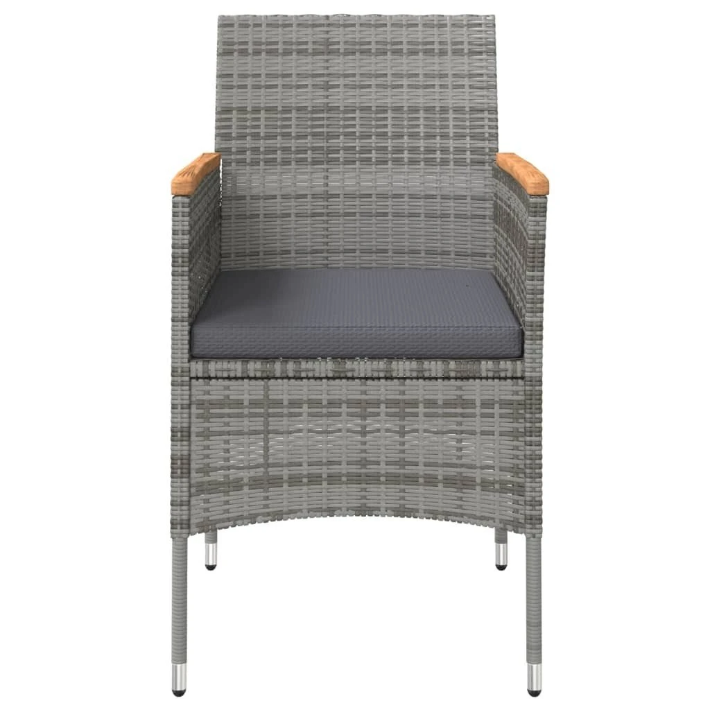 ¡Este juego de comedor para jardín es una excelente opción para cenar o relajarse en el espacio al aire libre de tu casa! Las estructuras de acero con recubrimiento en polvo hacen que la mesa y las sillas sean robustas y estables para usar a diario en exteriores. Gracias al ratán PE resistente al agua, las sillas son fáciles de limpiar y adecuadas para el uso diario. Asimismo, la lisa superficie de vidrio se limpia fácilmente con un paño húmedo y es perfecta para colocar comida, bebida y otros artículos decorativos. Nota: Para prolongar la vida de tus muebles de exterior, te recomendamos que los protejas con una funda impermeable. Color: Gris y negroMaterial: Ratán PE, acero con revestimiento en polvo, vidrio, madera maciza de acaciaDimensiones de la mesa: 80 x 80 x 74 cm (largo x ancho x altoDimensiones de la silla: 52 x 57 x 84 cm (ancho x profundo x altoAncho del asiento: 39/44.5 cmProfundidad del asiento: 46 cmAltura del reposabrazos desde el suelo: 62/65 cmGrosor del cojín del asiento: 4 cmRequiere montaje: SíLa entrega contiene:1 x Mesa4 x Silla4 x Cojín
