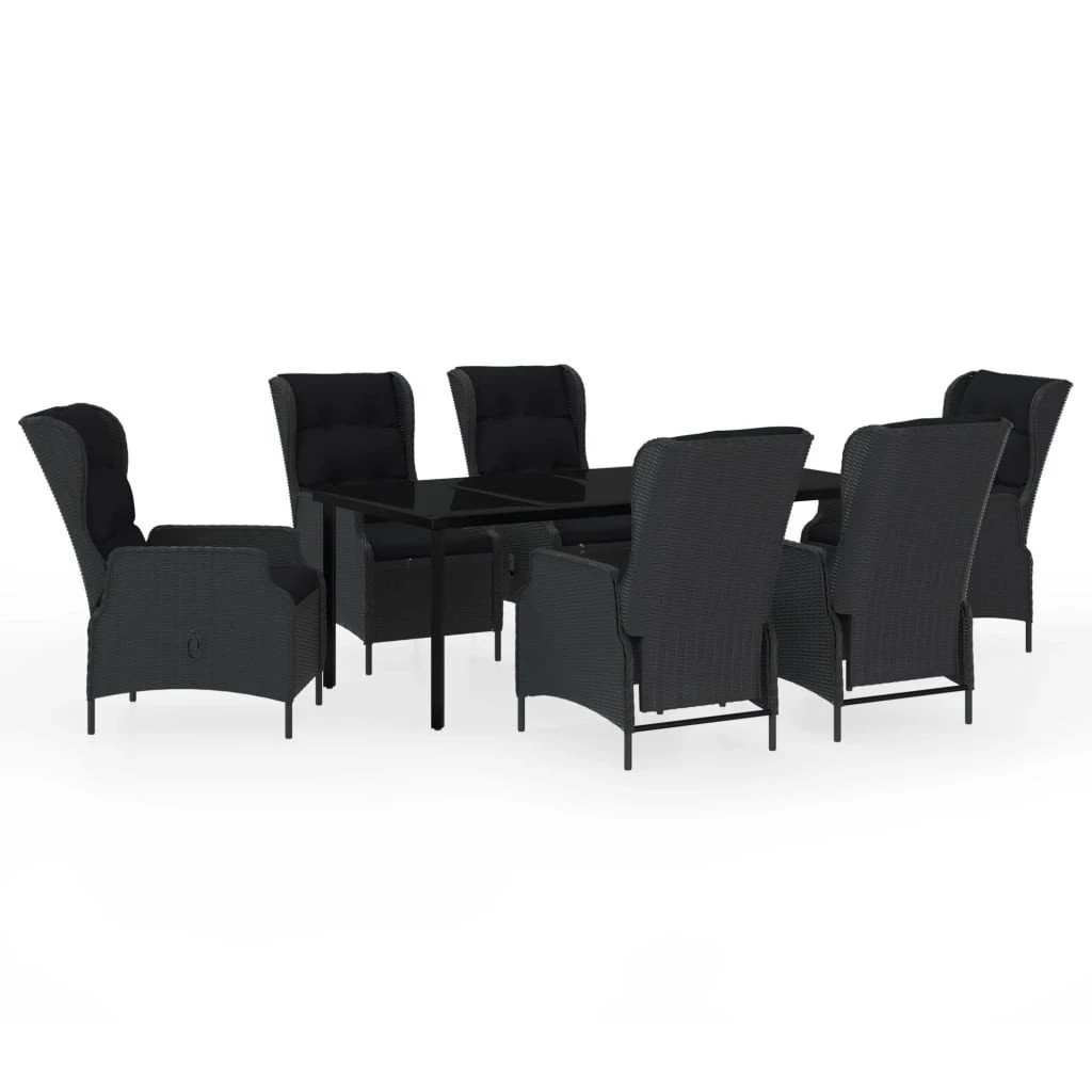 ¡Disfruta de una buena comida o cena en el espacio al aire libre de tu casa con este juego de comedor para jardín! Con un diseño elegante, ¡se convertirá en el centro de atención del jardín o patio! El práctico juego de comedor para exterior tiene una estructura de acero, por lo que es fuerte y robusto. Las sillas reclinables de jardín están hechas de ratán PE, resistente al agua y que no necesita mantenimiento, por lo que son perfectas para usar al aire libre. Los cojines acolchados dan un plus de comodidad a la hora de las comidas. La funda del cojín está equipada con una cremallera, es extraíble y lavable. Gracias al mecanismo de elevación a gas, el respaldo también se puede regular para que encuentres la mejor postura. Al tocar el botón del lateral, el respaldo se reclina para ofrecer una posición cómoda. Asimismo, la lisa superficie de vidrio se limpia fácilmente con un paño húmedo y es perfecta para colocar comida, bebida y otros artículos decorativos. Nota: Para prolongar la vida de tus muebles de exterior, te recomendamos que los protejas con una funda impermeable. Mesa:Color: NegroMaterial: Acero con recubrimiento en polvo, vidrioDimensiones: 200 x 100 x 74 cm (largo x ancho x altoSilla:Color de la silla: Gris oscuroColor del cojín: NegroMaterial de la silla: Ratán PE redondo, acero con recubrimiento en polvoMaterial del cojín: Funda 100% poliéster con relleno de espumaDimensiones de la silla (no reclinada: 57 x 88 x 100 cm (ancho x profundo x altoDimensiones de la silla (reclinada: 57 x 121 x 80 cm (ancho x profundo x altoAnchura del asiento: 50 cmProfundidad del asiento: 59 cmAltura del asiento desde el suelo: 39 cmAltura del reposabrazos desde el suelo: 60 cmGrosor del cojín del asiento: 6 cmGrosor del cojín de respaldo: 10 cmPosee función reclinableRequiere montaje: SíLa entrega contiene:1 x Mesa6 x Sillas6 x Cojines de asiento6 x Cojines de respaldo