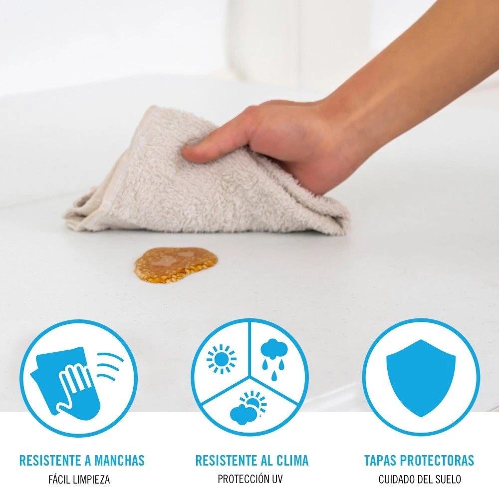 - Superficie de polietileno de alta densidad (42 mm ultrarresistente con protección UV y estructura de tubos de acero (25 mm revestido con polvo antióxido