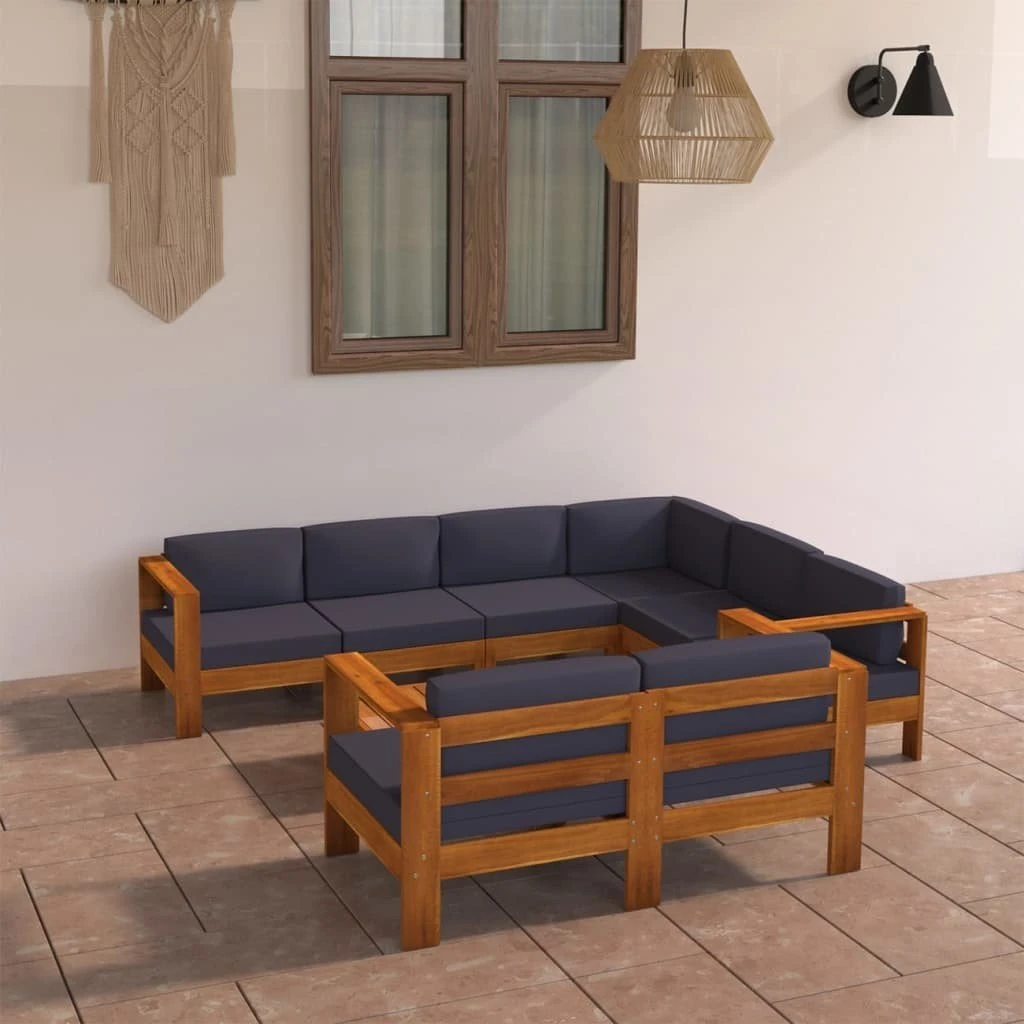 ¡Decora tu patio, conviértelo en un lugar acogedor para sentarse y apreciar lo que te rodea! El juego de jardín de madera es una opción ideal para relajarte y disfrutar del tiempo libre con amigos o familiares en el jardín, el patio o el balcón. El juego de jardín está cuidadosamente elaborado en madera maciza de acacia, lo que lo hace robusto, duradero y apto para uso al aire libre. Los cojines de asiento y acolchados densamente brindan comodidad adicional en tu tiempo de descanso. La superficie con acabado de aceite es fácil de limpiar con un paño húmedo. Además, la superficie robusta es ideal para colocar bebidas y comida al alcance de la mano. Nota: Para prolongar la vida útil de los muebles de exterior, te recomendamos que los limpies con regularidad y no los dejes al aire libre sin protección innecesariamente.Limpieza: Usar una solución de jabón suaveAlmacenamiento: Si es posible, guarda el producto en un lugar fresco y seco en el interior. Si el producto se almacena al aire libre, protégelo con una funda impermeable. Limpia y seca el exceso de agua o nieve de las superficies planas después de una lluvia o nevada. Permite la ventilación para evitar daños relacionados con la humedad. Color del asiento: Gris oscuroMaterial: Madera maciza de acacia con acabado al aceite, tejido (100% poliésterTamaño del sofá central (1 reposabrazos : 70 x 65 x 60 cm (ancho x profundo x altoDimensiones del sofá de esquina: 63 x 63 x 60 cm (ancho x profundo x altoDimensiones del sofá central: 61 x 63 x 60 cm (ancho x profundo x altoDimensiones de la mesa: 100 x 60 x 25 cm (largo x ancho x altoDimensiones del banco: 140 x 65 x 60 cm (ancho x profundo x altoGrosor del cojín de asiento: 10 cmGrosor del cojín respaldo: 10 cmRequiere montaje: SíLa entrega incluye:2 x Sofás centrales (con 1 reposabrazos 1 x Sofá de esquina3 x Sofás centrales1 x Mesa1 x Banco8 x Cojines de asiento9 x Cojines de respaldo