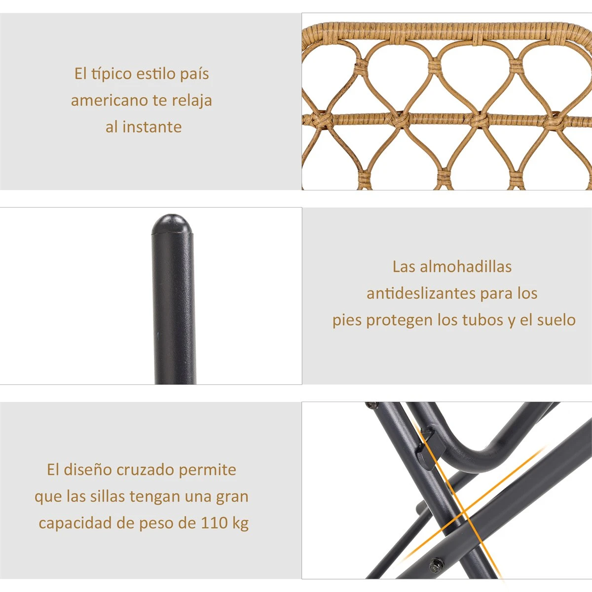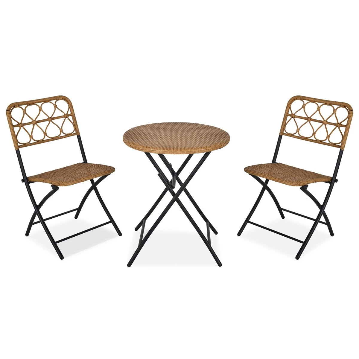 - – CONJUNTO DE 3 PIEZAS DE RATÁN: Este juego de exterior está compuesto por 2 sillas y una mesa redonda de ratán sintético. Para tomar un refresco al aire libre o disfrutar de una charla entre amigos, incluso en espacios pequeños – PLEGABLE: Tanto las dos sillas como la mesa se pueden plegar, por lo que son fáciles de mover y almacenar. Bastará con apoyarlas contra una pared o escondiéndolas detrás de una puerta para ahorrar espacio – ELEGANTE: Este conjunto de jardín emula el ratán natural, proporcionando elegancia y belleza a tu jardín, terraza, balcón, etc. Los respaldos de las sillas, ofrecen una estética muy original – ESTRUCTURA RESISTENTE: Hecho de ratán PE sobre estructura de acero, con tablero de refuerzo debajo de la mesa, para mayor resistencia. Ideal para uso prolongado a la intemperie – MEDIDAS TOTALES: mesa Φ60×71 cm (DiámxAL y silla 46x56x83 cm (LxANxAL