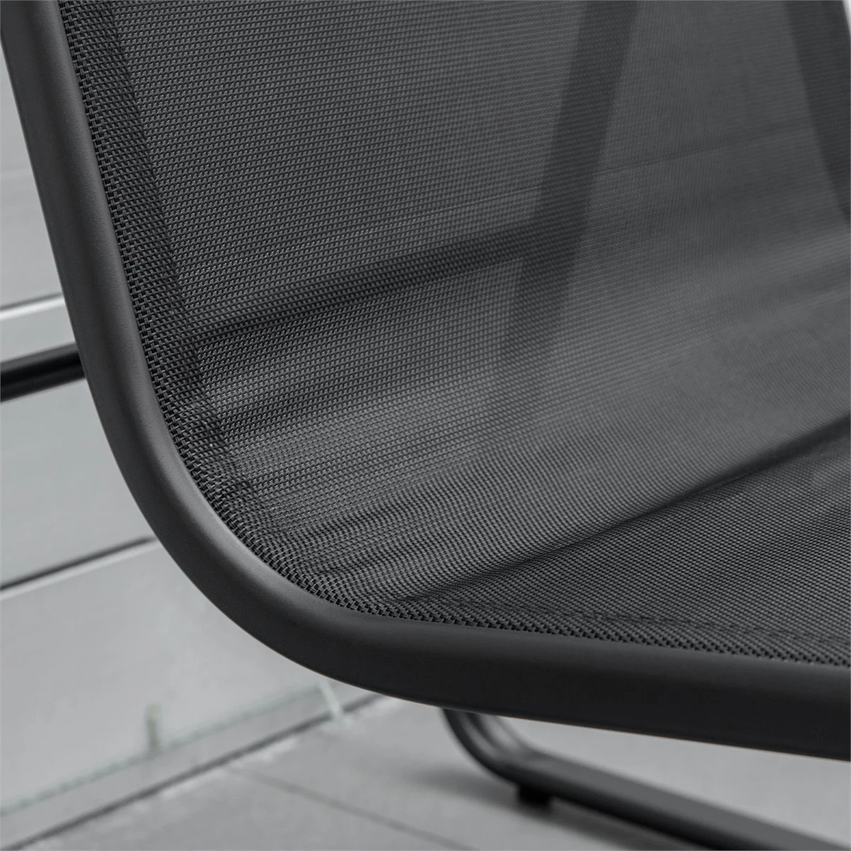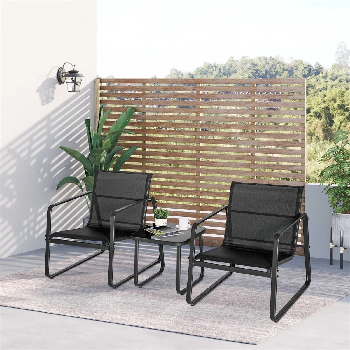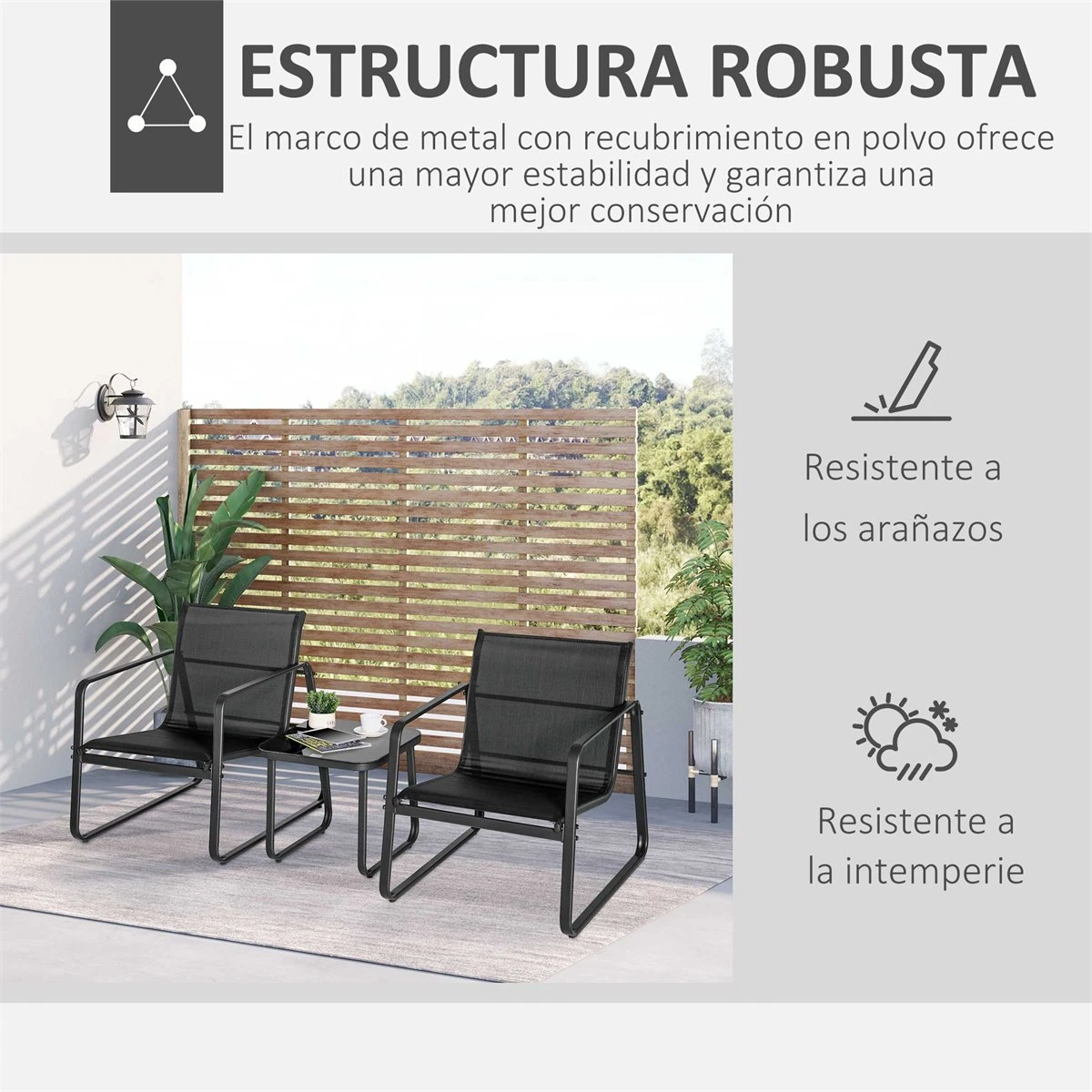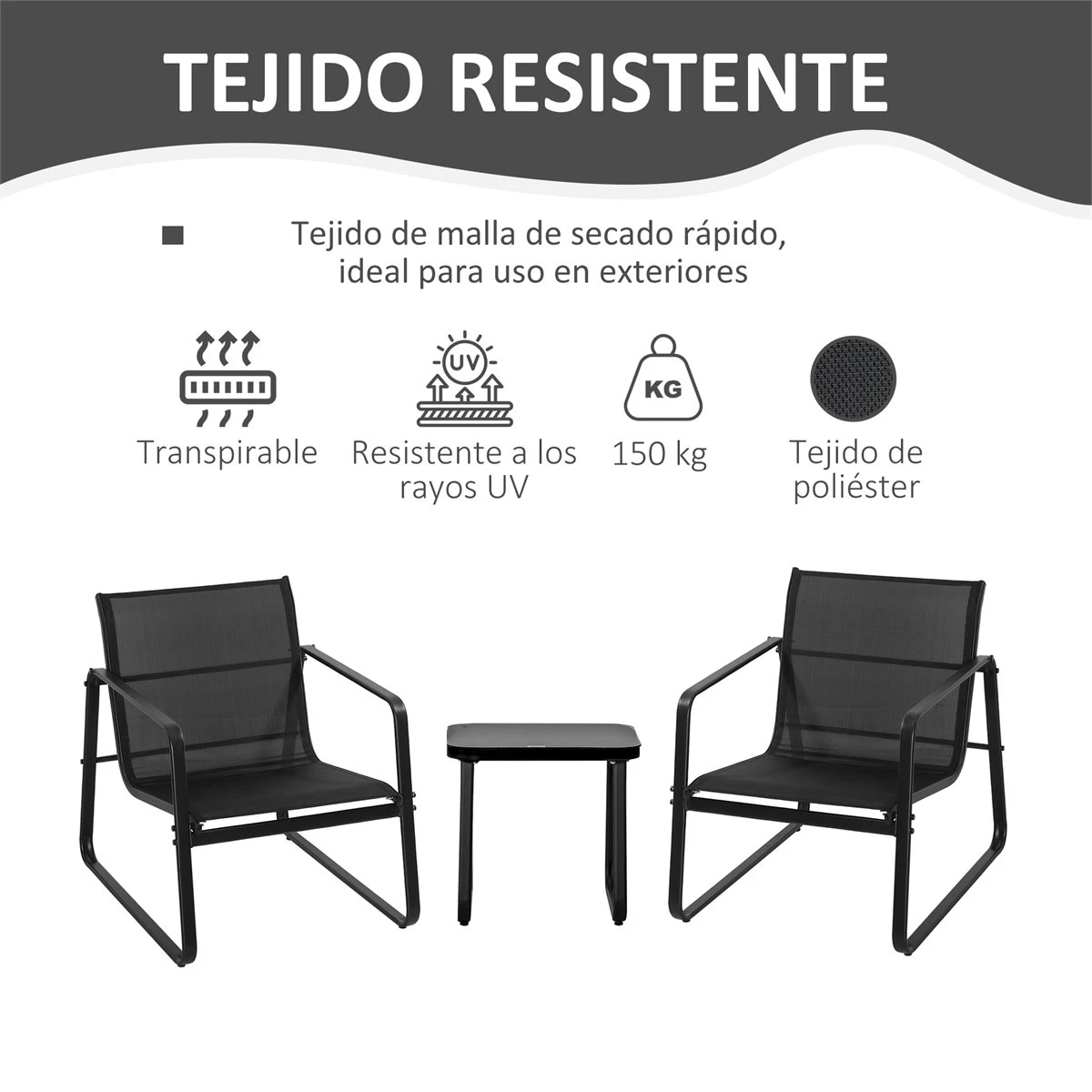 - – CONJUNTO DE 3 MUEBLES DE JARDÍN: Juego de muebles de jardín compuesto por 2 sillas y una mesa pequeña cuadrada con encimera de cristal templado. Ideal para desayunar, tomar el té de la tarde, charlar con los amigos y mucho más – MÚLTIPLES USOS: Este moderno y elegante conjunto de 1 mesa y 2 sillas de jardín será un complemento práctico y decorativo, perfecto para colocar en tu patio, jardín, cerca de la piscina u otros espacios al aire libre – ESTRUCTURA RESISTENTE: La estructura metálica de los muebles de exterior con recubrimiento en polvo ofrece una gran resistencia al óxido y a la intemperie. En cuanto a las sillas, el asiento y el respaldo de textileno transpirable con diseño curvo proporcionan una sensación de frescor y comodidad al sentarse – ENCIMERA DE CRISTAL TEMPLADO: La mesa de este conjunto de muebles de café tiene una encimera de vidrio templado de color negro. Resistente y fácil de limpiar, ideal para colocar bebidas o aperitivos mientras te relajas con amigos o solo – MEDIDAS TOTALES: Mesa 44x44x41 cm (LxANxAL y silla 62x80x75 cm (LxANxAL. Peso máximo soportado: 150 kg (silla y 50 kg (mesa. Requiere montaje