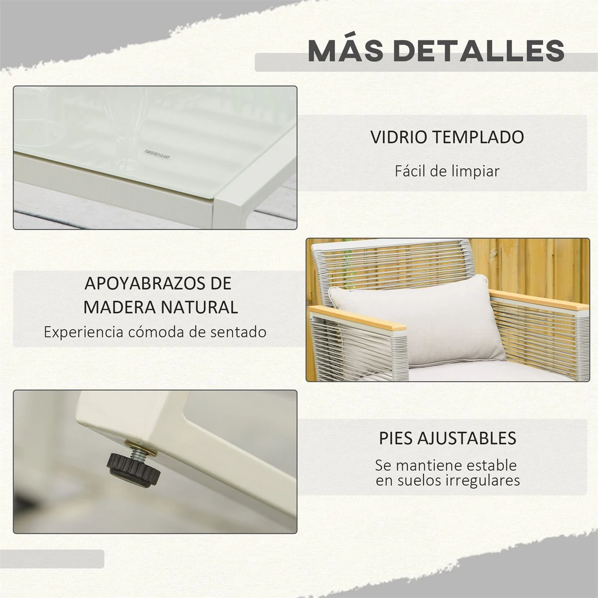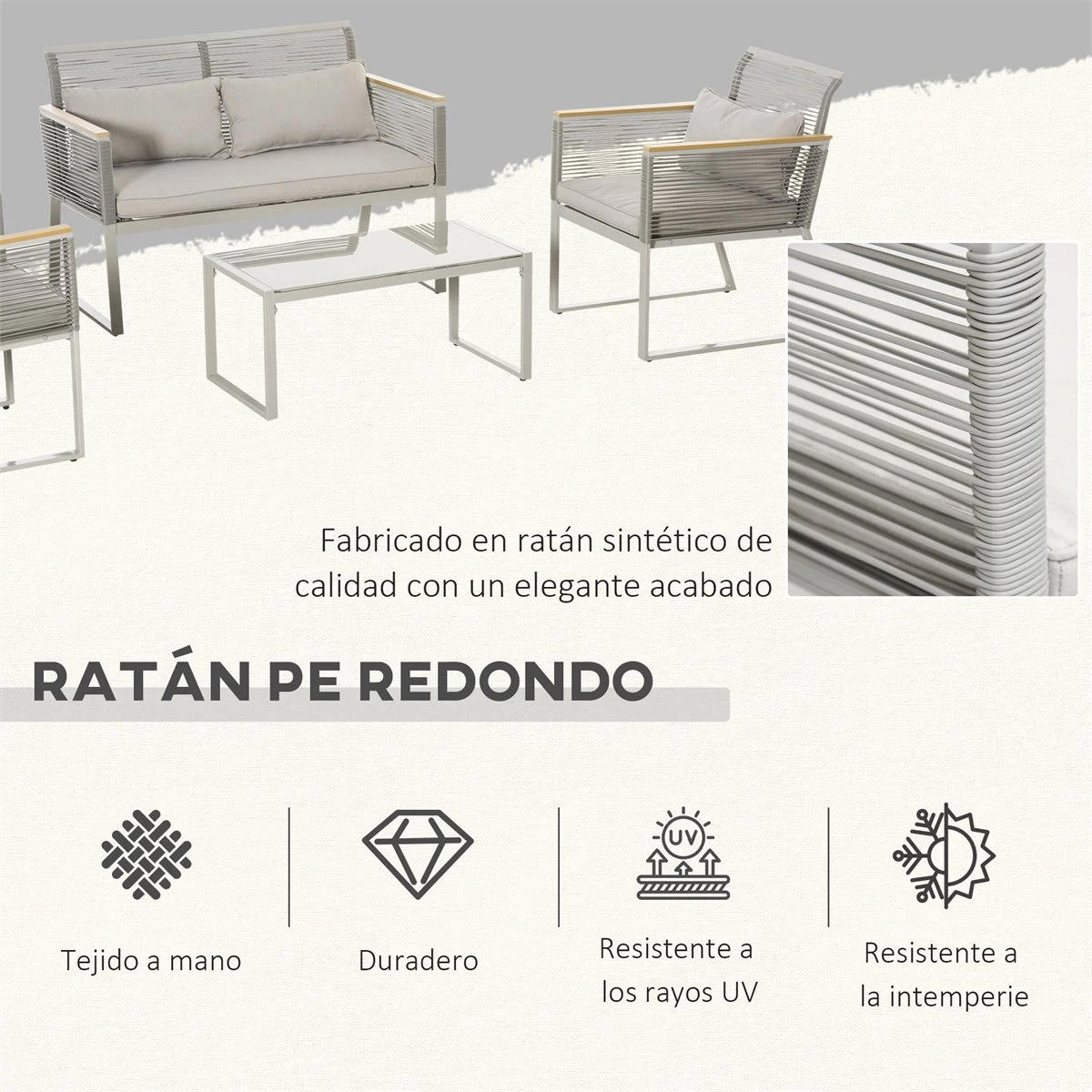¿Has visto este bonito conjunto de muebles de ratán de Outsunny? Está compuesto por 2 sillones individuales, 1 sofá doble y una bonita mesa de centro con encimera de cristal. Los 4 muebles están hechos de metal resistente, y el sofá y sillones cuentan además con cómodos apoyabrazos de madera y los laterales del asiento y el respaldo cubiertos de ratán sintético como si fueran cuerdas. Este conjunto cuenta con un diseño minimalista y actual que dará un toque elegante allá donde lo coloques. Características – Las fundas de los cojines de los asientos son extraíbles y se pueden sacar para limpiar. Los cojines de los respaldos NO son desenfundables – Tanto el sofá biplaza como los sillones individuales cuentan con cómodos apoyabrazos de madera de teca – Perfecto para usar junto a la piscina, jardín, terraza o cualquier otro espacio exterior – Fácil de montar Especificaciones – Color: gris – Material: metal, ratán PE, poliéster y madera de teca – Medidas del sofá individual: 59,5×68,5×79 cm (LxANxAL – Medidas del asiento del sofá individual 50,5×52,5 cm (LxAN – Medidas del sofá doble: 116×68,5×79 cm (LxANxAL – Medidas del asiento del sofá doble: 107×52,5 cm (LxAN – Altura del asiento: 37 cm – Medidas de la mesa de centro: 84x45x38 cm (LxANxAL – Carga máxima: 110 kg (sillón individual, 200 kg (sofá doble y 30 kg (mesa – Referencia: 867-100