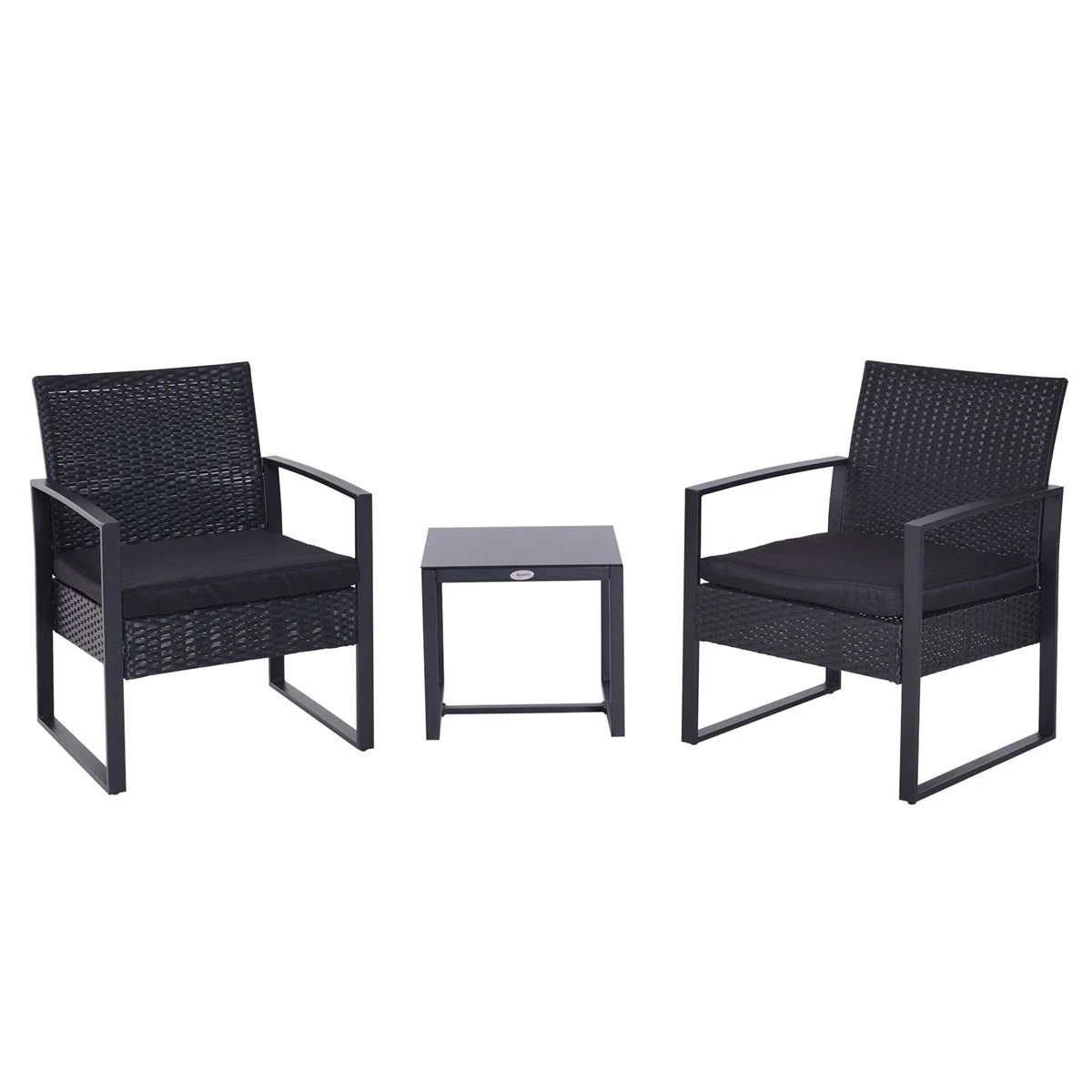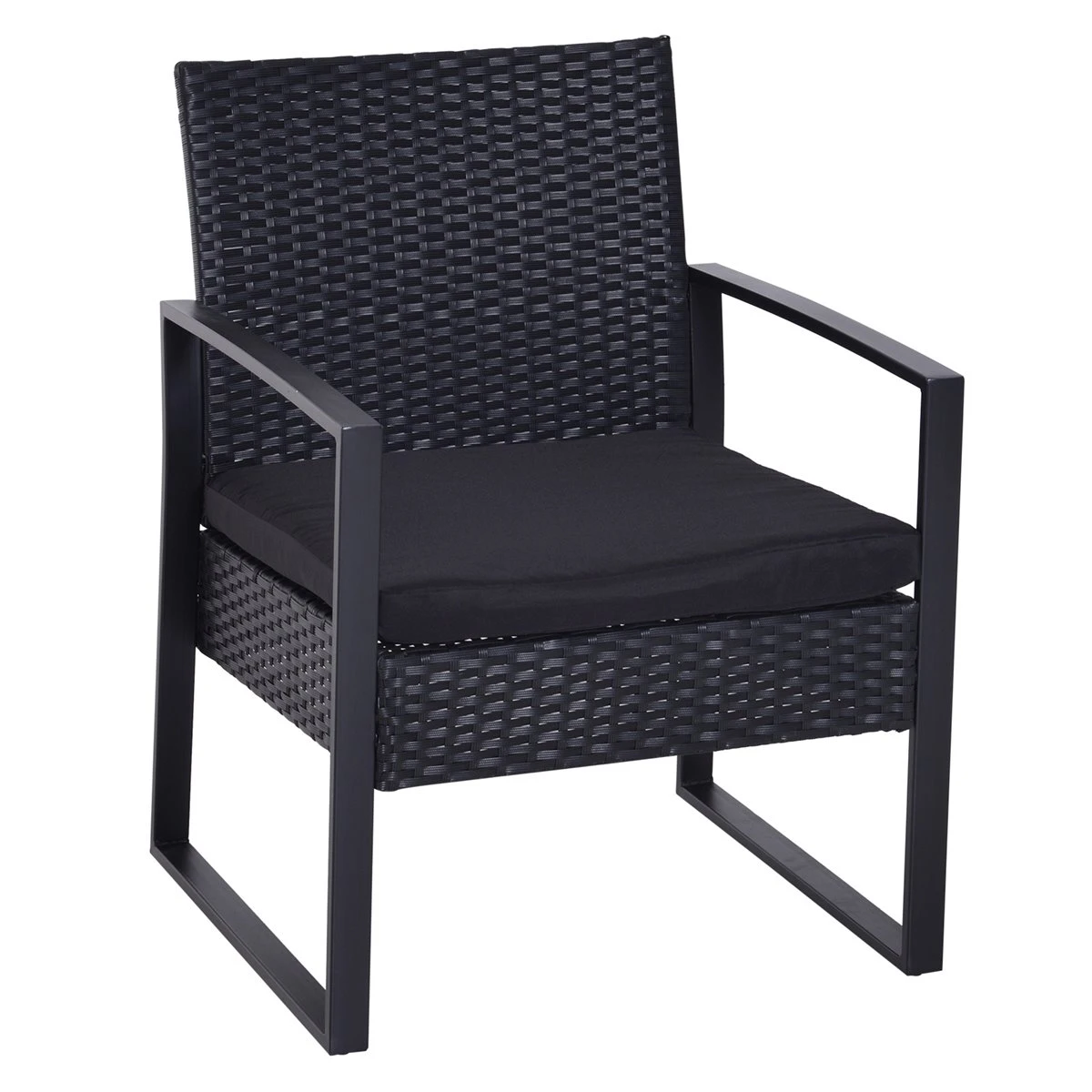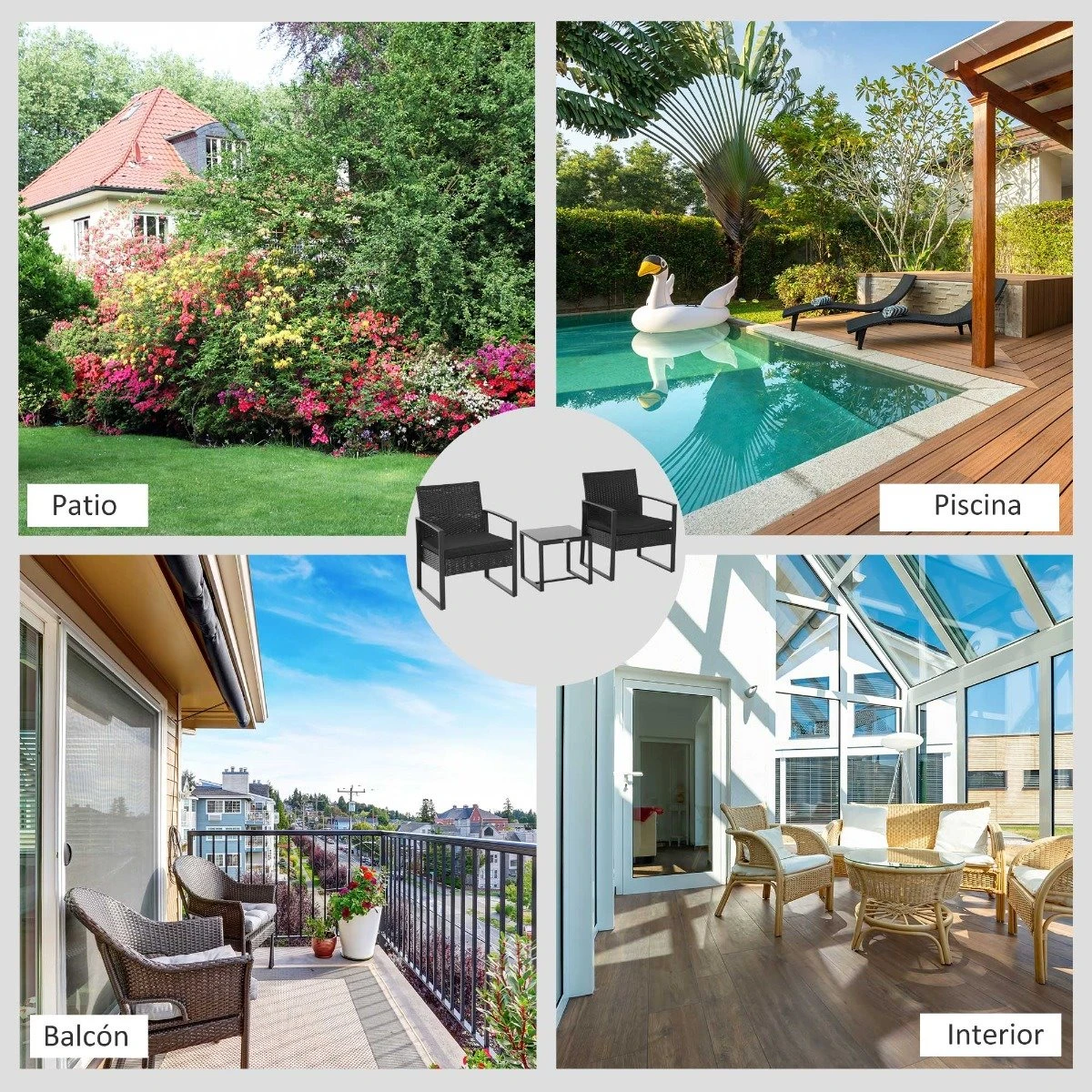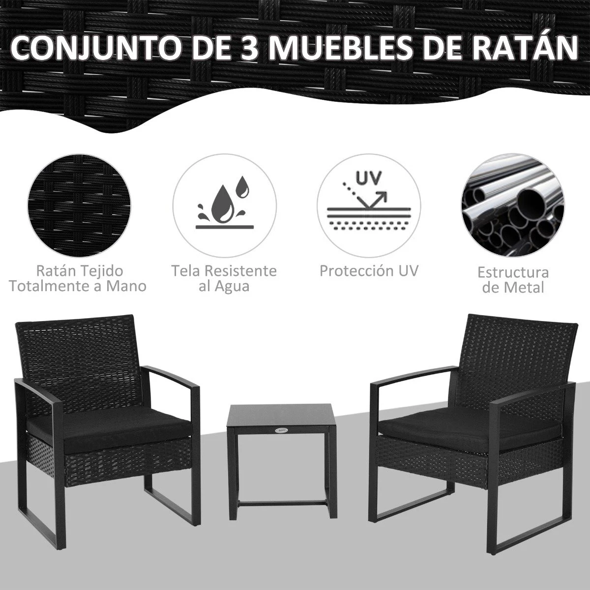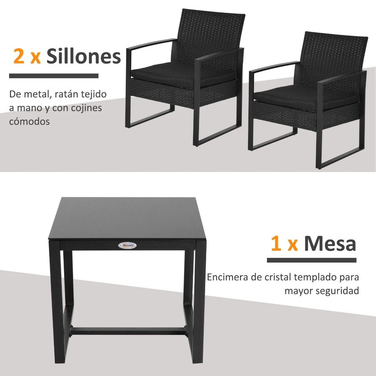 Este conjunto de ratán de Outsunny está compuesto por 1 mesa y 2 sillas con cojines de asiento. Aunque está pensado para exteriores como jardín, terraza, etc. su bonito diseño también lo hace apto para su colocación en interiores. Las 3 piezas están hechas con estructura metálica. La encimera de la mesa es de cristal templado y las 2 sillas cuentan con el asiento y el respaldo cubiertos de bonito ratán PE. Características – Conjunto de muebles de jardín compuesto por 2 sillas y 1 mesa – Adecuado tanto para su uso en exteriores, pero también en interiores – Perfecto para patio, terraza, jardín, al lado de la piscina o cualquier otro espacio al aire libre – Muebles con estructura metálica y sillas recubiertas de ratán PE – El ratán PE ofrece gran resistencia al agua y a los rayos UV – Incluye un cojín para cada uno de ellos asientos de las sillas para mayor comodidad de sentado – Las fundas de los cojines son extraíbles para poder sacar y lavar – La encimera de la mesita está hecha con cristal templado de 5 cm de espesor – Montaje rápido y sencillo nada más sacarlo de la caja Especificaciones – Color: negro – Material: ratán PE, metal, vidrio templado y tejido de poliéster – Medidas de la silla: 63x57x76 cm (LxANxAL – Medidas de la mesa: 42,5x40x39 cm (LxANxAL – Medidas del asiento: 50×51 cm (LxAN – Altura del asiento al suelo sin cojín: 36 cm – Altura del apoyabrazos al suelo: 57 cm – Medidas del respaldo: 50×44 cm (LxAL – Medidas del cristal templado: 40×42,5 cm (LxAN – Espesor del cojín: 5 cm – Carga máxima: 160 kg (cada silla y 30 kg (mesa – Referencia: 863-012