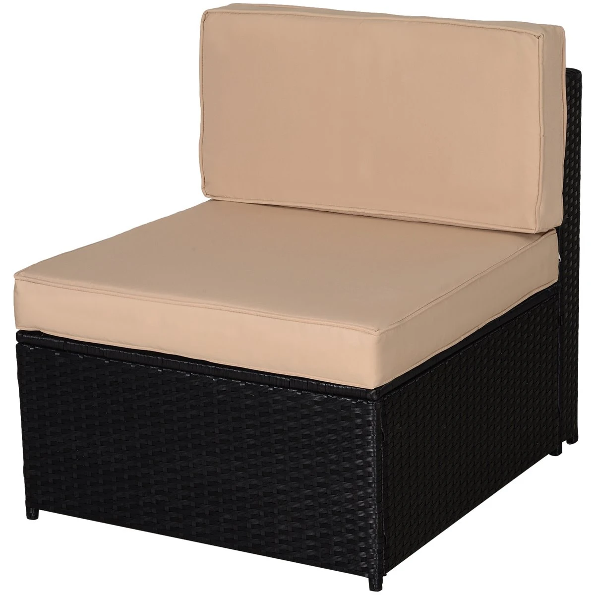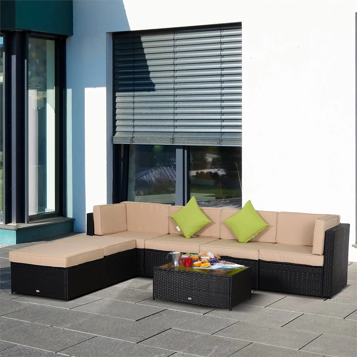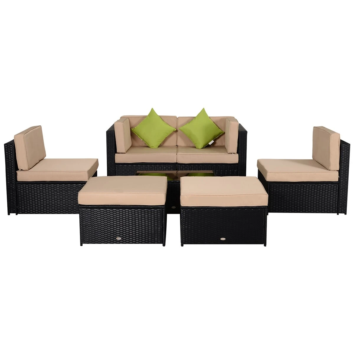 ¿Buscas un conjunto de muebles de exterior? No dejes de mirar este conjunto de Outsunny de 7 piezas, muy elegante para decorar tu jardín. Con estructura de acero galvanizado y ratán sintético, con gran resistencia a la intemperie y a los rayos UV. Con este producto podrás relajarte y disfrutar al aire libre. Características – Este conjunto de jardín incluye 2 sofás individuales, 2 sofás esquineros, 2 taburetes y 1 mesa – Perfecto para jardín, parque, patio, terraza u otros lugares al aire libre – Marco de metal galvanizado con recubrimiento en polvo, cubierto con ratán PE resistente a la intemperie – Cojines y almohadas acolchados gruesos para mayor comodidad – Los cojines de asiento cuentan con funda con cremallera, de poliéster, resistente al agua y fácil de limpiar – Pies con almohadillas ajustables antideslizantes ara mayor estabilidad y no rayar el suelo – La encimera de vidrio templado de 5 mm de espesor es resistente y fácil de limpiar – Se requiere montaje Especificaciones – Color: negro, arena, verde – Material: metal galvanizado, ratán PE, poliéster – Sofá esquinero: 80x80x71 cm (LxANxAL – Sofá individual: 70x80x71 cm (LxANxAL – Taburete: 70x70x34 cm (LxANxAL – Mesa: 85x55x34 cm (LxANxAL – Medidas de los asientos: 70x70x34 cm (LxANxAL – Cojines de asiento: 70x70x9 cm (LxANxAL – Cojines de respaldo: 70x37x9 cm (LxANxAL – Cojines decorativos: 40×40 cm (LxAN – Carga máxima: 160 kg (cada asiento, 120 kg (taburete, 50 kg (mesa – Referencia: 860-002V02