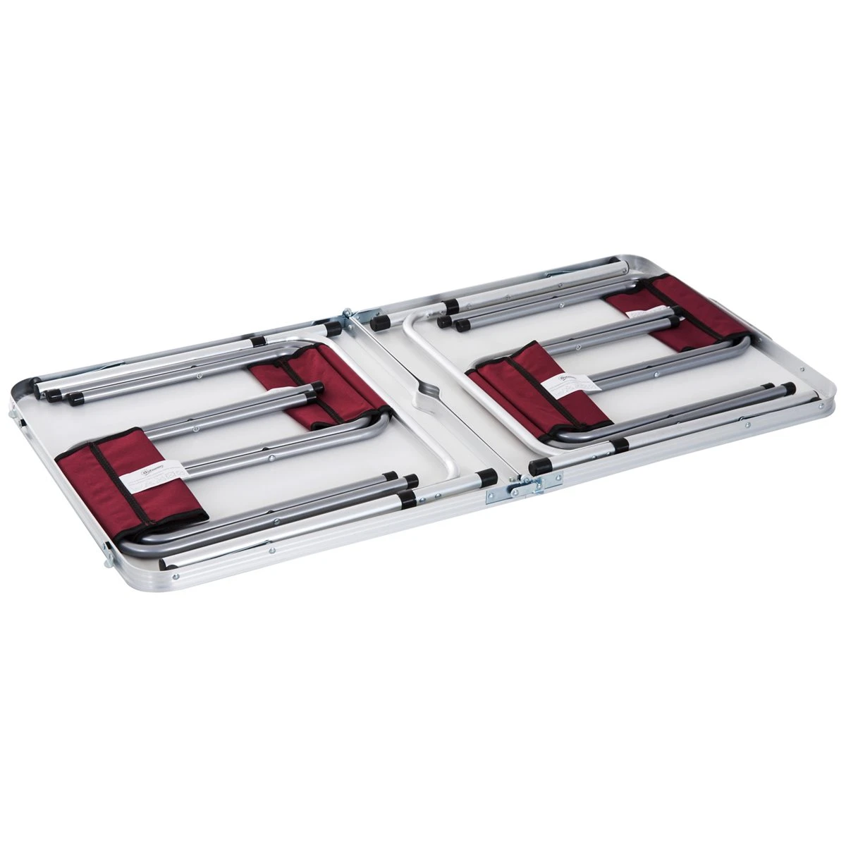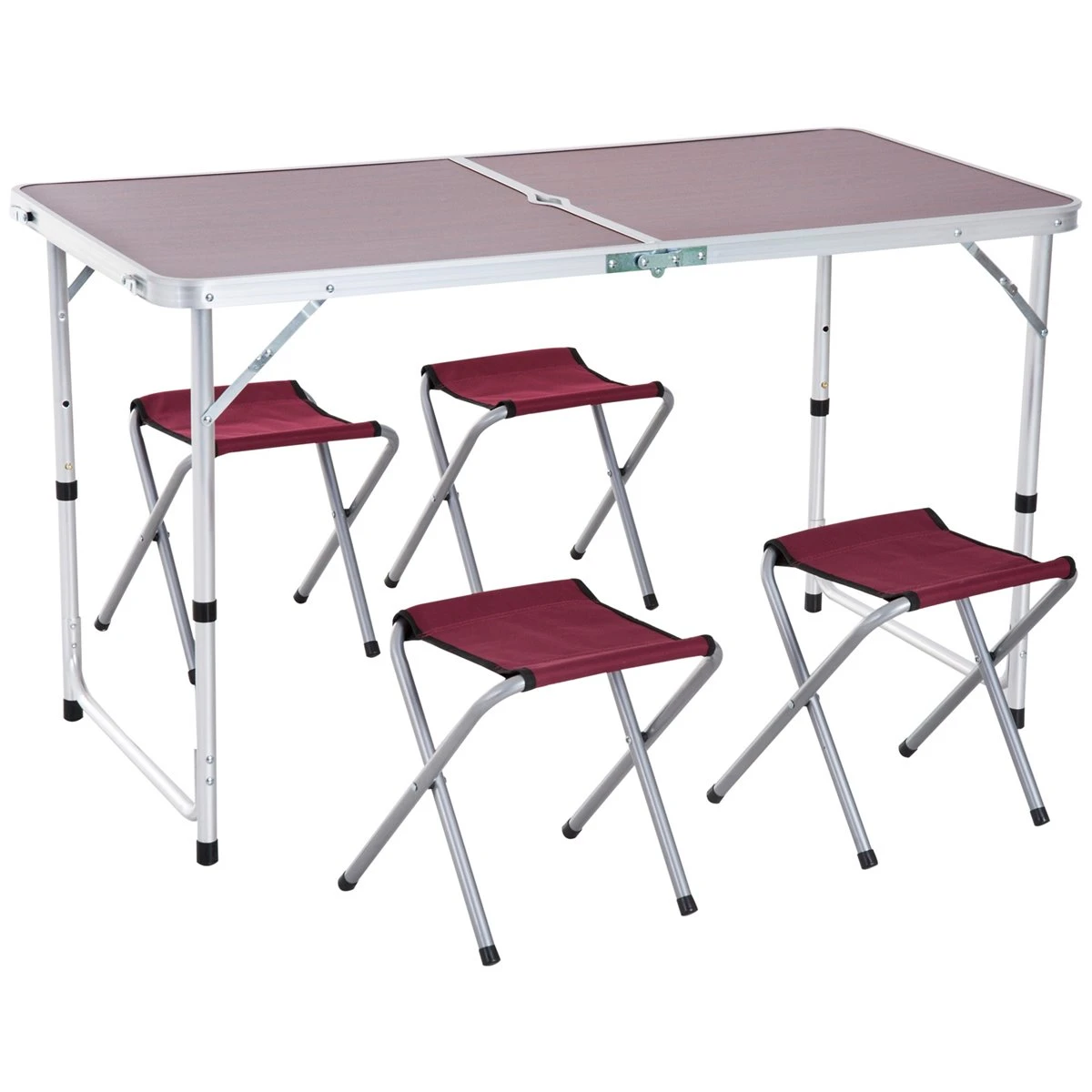 - – Conjunto de muebles que incluye 1 mesa y 4 taburetes. Se puede utilizar tanto en interiores como en exteriores. Perfecto para jardín, terraza, patio o cualquier espacio de exterior – Portátil: Se puede plegar como una maleta. Las sillas también pueden plegarse y colocarse dentro de la mesa, la cual viene con un mango para poder transportarla fácilmente – Ligero y robusto: La mesa viene fabricada con un marco muy ligero de aluminio. Las sillas están hechas de acero, lo cual garantiza una alta estabilidad – La altura de la mesa puede ajustarse a 3 niveles. Dispone de un agujero para la sombrilla en el medio de la mesa. El tablero de la mesa está hecho de MDF con un espesor de 4mm. La silla está cubierta de tela Oxford con recubrimiento de PVC – No necesita montaje, perfecta para usar en el aire libre. Dimensiones de la mesa: 120x60x69cm (LxANxAL, dimensiones de la silla: 26×33,5×36 cm (LxANxAL, altura ajustable de la mesa: 69cm, 61cm, 53cm, dimensiones plegables de la silla: 60x60x7cm (LxANxAL. Agujero para la sombrilla: Ф31mm. Capacidad de carga: mesa: 25kg, silla: 80kg
