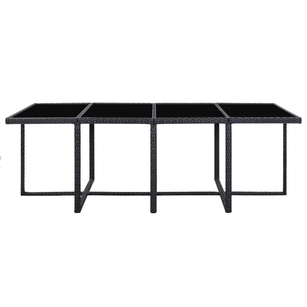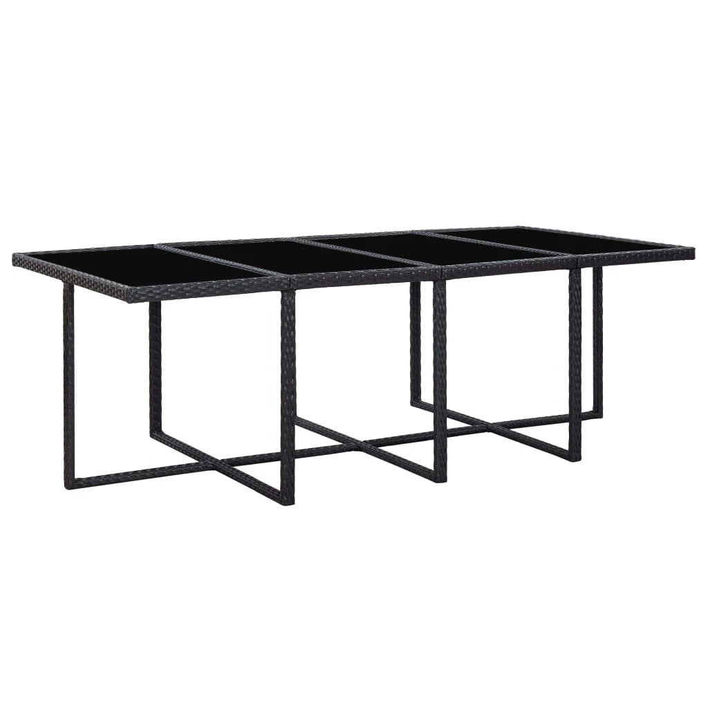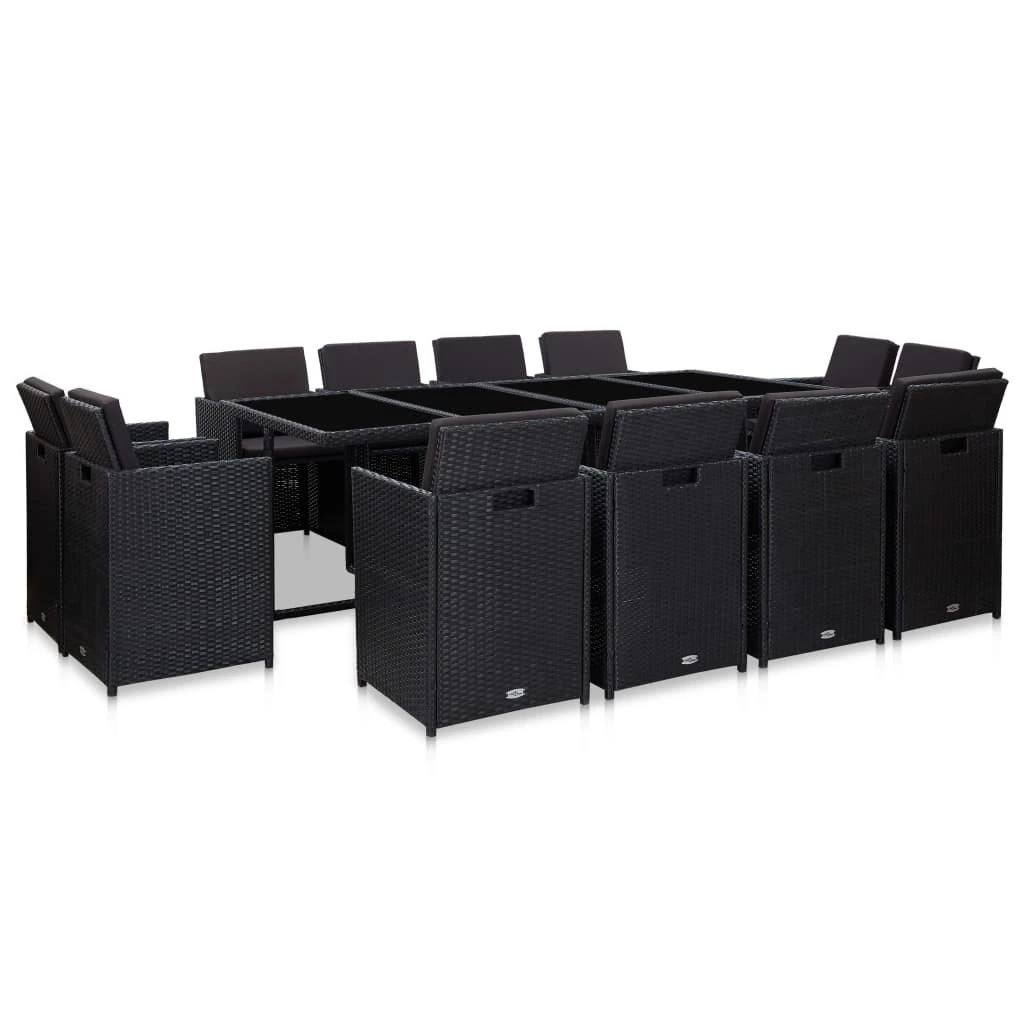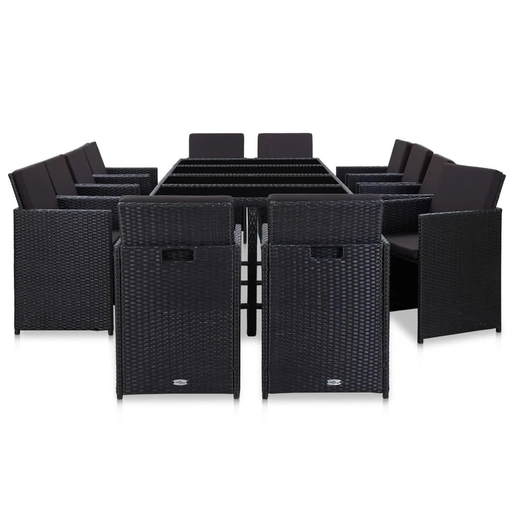 ¡Nuestro elegante set de muebles de ratán para jardín, se convertirá en el punto de atracción de tu jardín o patio! Este conjunto de comedor de ratán, con un diseño elegante, será una gran opción para comer al aire libre o relajarse en el jardín. Hecho de ratán PE resistente a la intemperie e impermeable, el juego de comedor es fácil de limpiar, resistente y adecuado para el uso diario. La estructura de acero con recubrimiento en polvo hacen que la mesa y las sillas sean fuertes y resistentes. Gracias a su construcción ligera, todos los artículos son fáciles de mover. La mesa de cristal es fácil de limpiar con un paño húmedo. Los cojines de asiento y respaldo gruesos, suaves y rellenos de espuma, son muy cómodos y están hechos de poliéster hidrófugo. Las fundas de cojín con cremalleras se pueden quitar y lavar fácilmente. Nota: Se recomienda cubrir el set en caso de lluvia, nieve y heladas. Color del ratán: NegroColor cojín: NegroMaterial: Estructura de acero + ratán PE + encimera de cristalMaterial de cojín: Funda de poliéster con relleno de espumaDimensiones de la mesa: 225 x 109 x 74 cm (largo x ancho x altoDimensiones de las sillas: 52 x 56 x 85 cm (ancho x profundo x altoProfundidad del asiento: 40 cmAnchura del asiento: 46,5 cmAltura del asiento desde el suelo: 44 cmAltura del reposabrazos desde el suelo: 67 cmGrosor del cojín: 5 cmFunda de cojín extraíbleLa entrega incluye:1 x Mesa12 x Sillas24 x Cojines