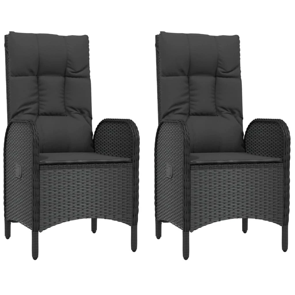 Este moderno juego de comedor de jardín, con un diseño elegante y contemporáneo, es una excelente opción para comer o relajarse en el jardín. Material resistente a la intemperie: El ratán PE, también conocido como ratán sintético, es resistente a la intemperie y fácil de limpiar. La parte exterior se mantiene hermosa durante mucho tiempo. Ofrece una gran calidad, comodidad y aspecto estético.Estructura robusta: Las estructuras de acero con recubrimiento en polvo hacen que el juego de comedor para exterior sea resistente y estable para usar a diario al aire libre.Superficie práctica: La superficie de madera maciza de acacia es perfecta para colocar bebidas, comida y adornos. Es bonita y fácil de limpiar.Función reclinable: Las sillas de jardín está especialmente diseñadas con una función reclinable para que puedas ajustar el respaldo según tu comodidad.Cómodo asiento: El respaldo añade un plus de comodidad al asiento de la silla de jardín. Además, los cojines gruesos y acolchados proporcionan comodidad al asiento. Información útil:Para facilitar al máximo el montaje, cada producto se entrega con un manual. Nota:Para asegurarte de que tus muebles de exterior se mantengan hermosos, recomendamos protegerlos con una funda impermeable. Color: NegroColor del cojín: NegroSilla reclinable de jardín:Material: Ratán PE, acero con recubrimiento en polvoMaterial de la funda del cojín: Tela (100% poliésterDimensiones: 57 x 62,5 x 109 cm (ancho x profundo x altoDimensiones del asiento: 50 x 47 cm (ancho x profundoAltura del asiento desde el suelo: 43 cmAltura del reposabrazos desde el suelo: 62 cmDimensiones del cojín de respaldo: 50 x 68 x 10 cm (ancho x profundo x grosorDimensiones del cojín de asiento: 50 x 47 x 3 cm (ancho x profundo x grosorRespaldo ajustableMesa:Material: Acero con recubrimiento en polvo, madera maciza de acacia con acabado de aceiteDimensiones: 80 x 80 x 74 cm (largo x ancho x altoLa entrega incluye:2 x Sillas reclinables de jardín2 x Cojines de respaldo2 x Cojines de asiento1 x Mesa