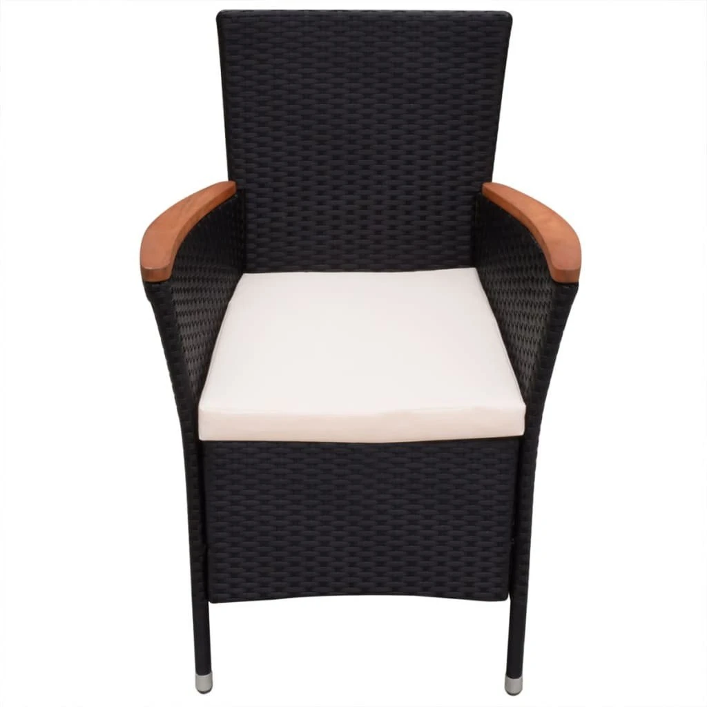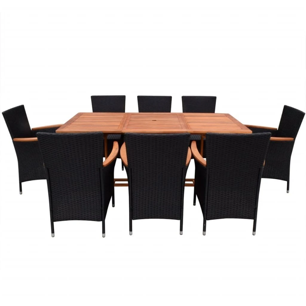 Este conjunto de comedor de jardín de ratán, tiene un diseño elegante y consta de 1 mesa, 8 sillas y 8 cojines de asiento amovibles. Nuestro conjunto de muebles de jardín de poli ratán ¡será el centro de atención de su jardín o patio! La mesa de comedor está hecha de madera de acacia de alta calidad, una madera dura tropical resistente a la intemperie y muy duradera. Por ello, es muy adecuada para el uso en exteriores. Las sillas de comedor tienen reposabrazos de madera de acacia. Hechas de ratán PE impermeable, las sillas son ligeras y de fácil limpieza, mientras que las estructuras de acero con revestimiento en polvo y las patas de aluminio hacen que sean resistentes y robustas. Los cojines de asiento gruesos y extraíbles son muy cómodos. Las fundas de cojín se puedes quitar y lavar fácilmente. La entrega incluye 1 mesa de madera de acacia, 8 sillas de ratán PE y 8 cojines amovibles para los asientos. Nota: Rcomendamos cubrir el conjunto en condiciones de lluvia, nieve y heladas. Mesa:Color: MarrónMaterial: Madera de acacia con un ligero acabado de aceiteDimensiones: 180 x 90 x 74,5 cm (largo x ancho x altoCon un hueco para sombrilla en el centro de la mesaSillas:Color: NegroMaterial: Ratán PE + reposabrazos de madera de acacia + estructura de acero con recubrimiento en polvo + pies de aluminioDimensiones: 58 x 61 x 88 cm (ancho x profundo x altoAnchura del asiento: 39-42 cmProfundidad del asiento: 47,5 cmAltura del asiento desde el suelo: 42 cmAltura del reposabrazos desde el suelo: 65 cmCojines:Color: Blanco cremaMaterial: 100% poliésterFundas de cojín lavablesLa entrega incluye1 mesa, 8 sillas y 8 cojines para el asientoFácil montaje