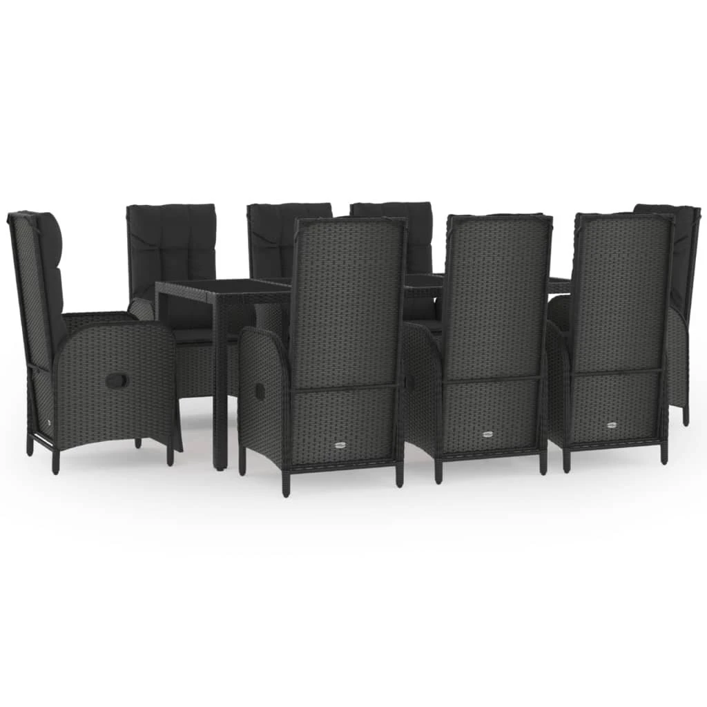 Este moderno juego de comedor de jardín, con un diseño elegante y contemporáneo, es una excelente opción para comer o relajarse en el jardín. Material resistente a la intemperie: El ratán PE, también conocido como ratán sintético, es resistente a la intemperie y fácil de limpiar. La parte exterior se mantiene hermosa durante mucho tiempo. Ofrece una gran calidad, comodidad y aspecto estético.Estructura robusta: Las estructuras de acero con recubrimiento en polvo hacen que el juego de comedor para exterior sea resistente y estable para usar a diario al aire libre.Superficie práctica: La superficie de madera maciza de acacia es perfecta para colocar bebidas, comida y adornos. Es bonita y fácil de limpiar.Función reclinable: Las sillas de jardín está especialmente diseñadas con una función reclinable para que puedas ajustar el respaldo según tu comodidad.Cómodo asiento: El respaldo añade un plus de comodidad al asiento de la silla de jardín. Además, los cojines gruesos y acolchados proporcionan comodidad al asiento. Información útil:Para facilitar al máximo el montaje, cada producto se entrega con un manual. Nota:Para asegurarte de que tus muebles de exterior se mantengan hermosos, recomendamos protegerlos con una funda impermeable. Color: NegroColor del cojín: NegroSilla reclinable de jardín:Material: Ratán PE, acero con recubrimiento en polvoMaterial de la funda del cojín: Tela (100% poliésterDimensiones: 57 x 62,5 x 109 cm (ancho x profundo x altoDimensiones del asiento: 50 x 47 cm (ancho x profundoAltura del asiento desde el suelo: 43 cmAltura del reposabrazos desde el suelo: 62 cmDimensiones del cojín de respaldo: 50 x 68 x 10 cm (ancho x profundo x grosorDimensiones del cojín de asiento: 50 x 47 x 3 cm (ancho x profundo x grosorRespaldo ajustableSilla reclinable de jardín:Dimensiones: 57 x 62,5 x 109 cm (ancho x profundo x altoDimensiones del cojín de asiento: 50 x 82 x 3 cm (ancho x profundo x grosorReposapiés y respaldo ajustablesMesa:Material: Ratán PE, acero con recubrimiento en polvo, madera maciza de acacia con acabado de aceiteDimensiones: 190 x 90 x 75 cm (ancho x profundo x altoLa entrega incluye:8 x Sillas reclinables de jardín8 x Cojines de respaldo8 x Cojín de asiento1 x Mesa