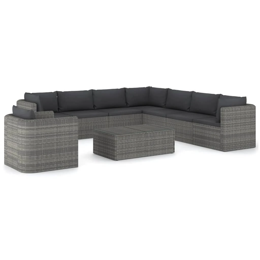 Este juego de muebles de jardín ofrece una generosa superficie de asiento y también resulta moderno con un toque de clase para tu jardín o patio. Gracias al ratán sintético impermeable, este juego de muebles de exterior es fácil de limpiar, resistente y adecuado para usar a diario al aire libre. Se entrega con cojines de asiento y almohadones de respaldo acolchados para el máximo confort, por lo que es un sofá tan cómodo como uno de interior. La funda de poliéster, que apenas necesita mantenimiento, se puede quitar y lavar. Este conjunto de muebles ofrece una flexibilidad total y se puede mover fácilmente para adaptarlo a cualquier disposición. Nota: Te recomendamos tapar el mueble en condiciones de lluvia, nieve y heladas. Color: GrisMaterial: Ratán sintético, acero con recubrimiento en polvo, vidrioMaterial de la funda de cojín y almohada: 100% poliésterSofá de esquina:Dimensiones: 72 x 72 x 63 cm (ancho x profundo x altoAnchura del asiento: 62 cmProfundidad del asiento: 62 cmAltura del asiento desde el suelo (sin cojín: 33 cmSofá central:Dimensiones: 68 x 72 x 63 cm (ancho x profundo x altoAnchura del asiento: 68 cmProfundidad del asiento: 62 cmAltura del asiento desde el suelo (sin cojín: 33 cmSilla de jardín:Dimensiones: 80 x 72 x 63 cm (ancho x profundo x altoAnchura de asiento: 60 cmProfundidad del asiento: 62 cmAltura del asiento desde el suelo: 32 cmDimensiones de la mesa de centro: 100 x 60 x 33 cm (largo x ancho x altoGrosor del cojín: 6 cmGrosor de almohadas: 15 cmLa entrega incluye:3 x Sofás de esquina4 x Sofás centrales1 x Silla de jardín1 x Mesa de centro8 x Cojines de asiento11 x Almohadones de respaldo