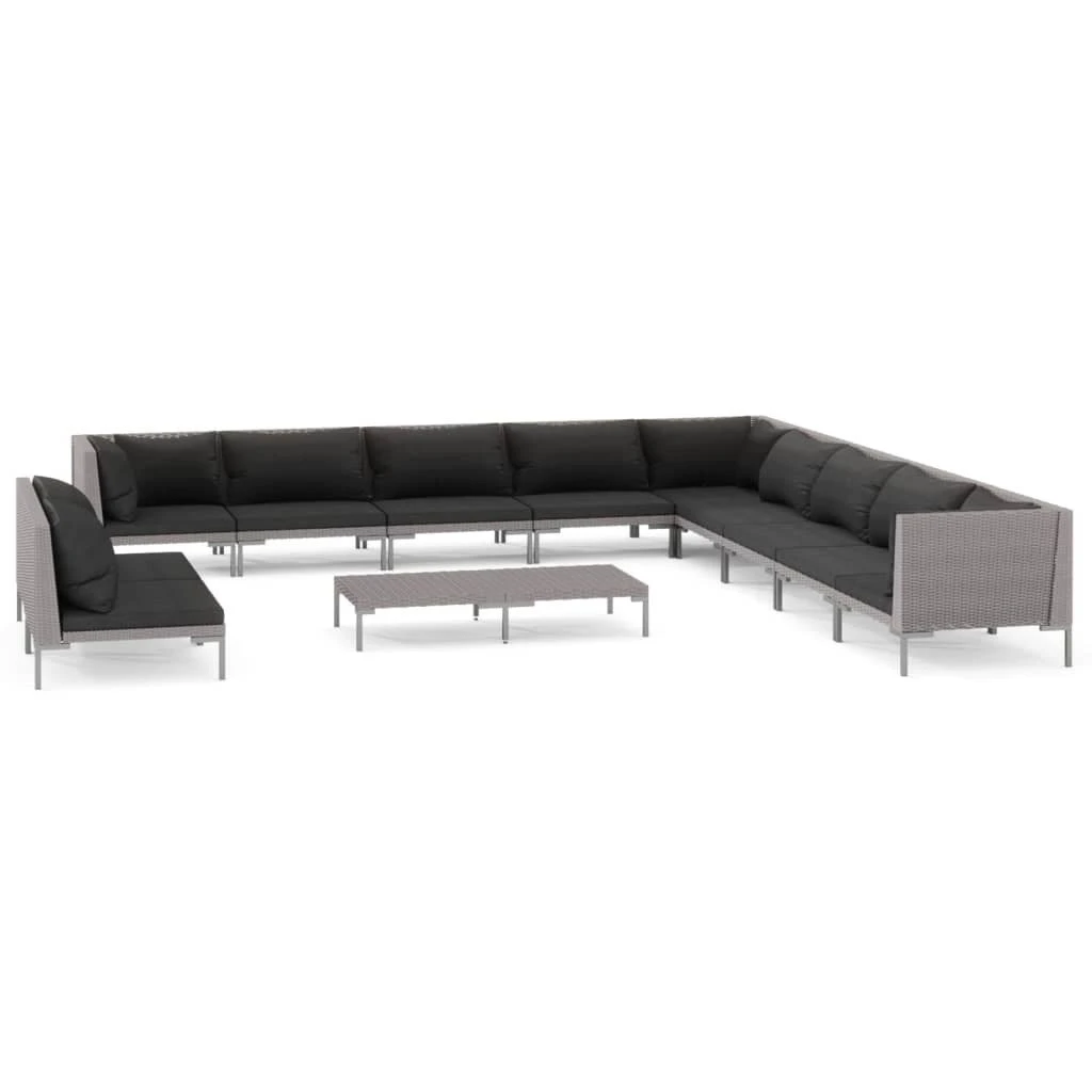 ¡Relájate y disfruta del espacio al aire libre de tu casa con este clásico juego de muebles para jardín! Estructura robusta: Con una estructura de acero con recubrimiento en polvo, el juego de muebles de patio es robusto y duradero. Construcción ligera: La construcción ligera hace que el juego de sofás sea fácil de mover.Material de primera calidad: Hecho de ratán PE semicircular, este juego de muebles para exteriores es resistente a la intemperie y al agua, fácil de limpiar y mantener. Cómodos cojines y almohadas: Los cojines y las almohadas acolchados gruesos y extraíbles brindan una comodidad óptima para que te sientes al aire libre. Nota:Recomendamos cubrir el conjunto de jardín en caso de lluvia, nieve y heladas para que dure más tiempo. Además, te recomendamos limpiarlo regularmente para alargar la vida de los muebles de exterior. No lo dejes al aire libre sin protección innecesariamente.Limpieza: Usa una solución de jabón suaveAlmacenamiento: Si es posible, guárdala en un lugar fresco y seco en el interior. Si el producto se almacena en el exterior, protégelo con una cubierta impermeable. Limpia y seca el exceso de agua o nieve de las superficies planas después de una lluvia o nevada. Permite la ventilación para evitar daños relacionados con la humedad. Color del ratán: Gris oscuroColor del cojín: NegroMaterial: Acero con recubrimiento en polvo, ratán PE semicircular, tablero de PC, tela (100 % poliésterMaterial de relleno: EspumaSofá central:Dimensiones: 70 x 70 x 61 cm (ancho x profundo x altoDimensiones de asiento: 70 x 60 cm (ancho x profundoAltura del asiento desde el suelo: 21 cmDimensiones del cojín del asiento: 68 x 58 cm (ancho x profundoDimensiones del cojín del respaldo: 68 x 37 cm (ancho x altoSofá esquinero:Dimensiones: 70 x 70 x 61 cm (ancho x profundo x altoDimensiones del asiento: 60 x 60 cm (ancho x profundoAltura del asiento desde el suelo: 21 cmDimensiones del cojín del asiento: 58 x 58 cm (ancho x profundoDimensiones del cojín del respaldo: 50/59 x 37 cm (ancho x altoMesa de centro:Dimensiones: 120 x 55 x 21 cm (largo x ancho x altoRequiere montaje: SíLa entrega contiene:8 x Sofás centrales3 x Sofá esquinero1 x Mesa de centro11 x Cojines de asiento14 x Cojines de respaldo