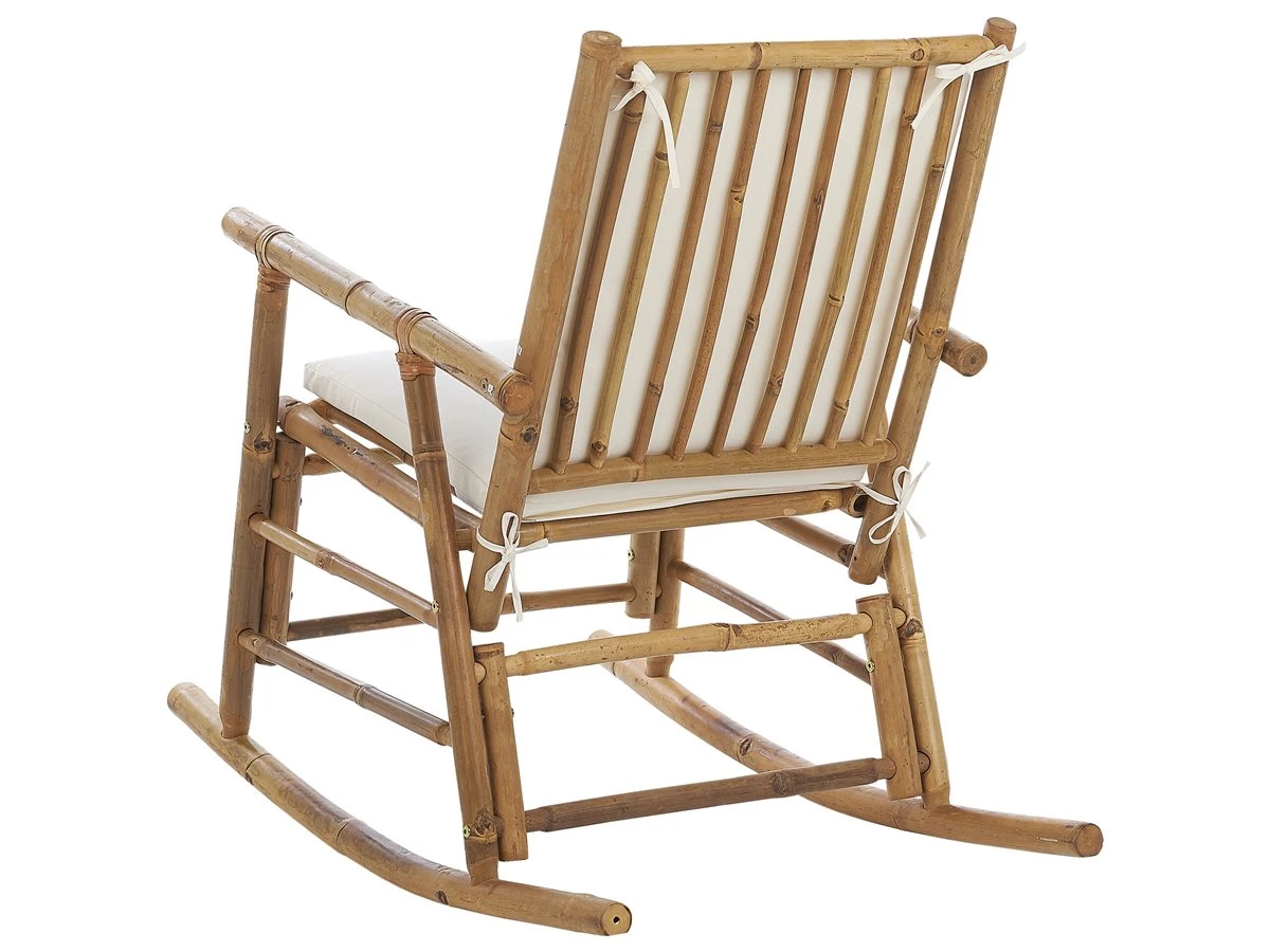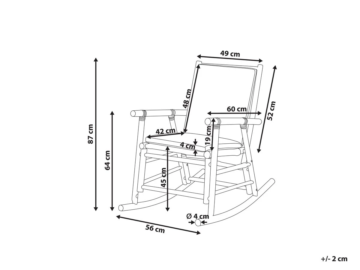 Sillón de diseño boho. Añade comodidad y un toque boho a tu interior o exterior con esta silla mecedora. Está fabricada a partir de madera de bambú natural resistente y duradera. El asiento, el respaldo y los cojines acolchados proporcionan la máxima comodidad de uso. Detalles: Tipo de Producto: Silla mecedora Estilo: Boho Color: Madera clara Tonalidad: Blanco crema Tipo de material: Madera maciza Material principal: Madera de bambú Material adicional: Poliéster Material de las patas: Madera maciza Material del asiento: Tejido Composición del Material: 100% Poliéster Apoyabrazo: Sí Acabado: Natural Plegable: No Densidad de espuma del asiento: 180 kg/m3 Apilable: No Dimensiones: Altura del apoyabrazos: 64 cm Espesor del asiento: 4 cm Altura del asiento: 45 cm Ancho: 56 cm Altura: 87 cm Superficie del asiento: 42×42 cm Peso: 8 kg Capacidad de peso: 100 kg La oferta incluye: 1 x Silla mecedora, 1 x Cojín del asiento, 1 x Cojín del respaldo Ventajas: Agradable función de balanceo, Las tiras ofrecen una fijación segura, Respaldo alto y asiento muy cómodo, Apariencia elegante, Materiales de la más alta calidad, No requiere mantenimiento regular, Resistencia UV 5 (ISO 105-B02 Información de montaje: Requiere montaje completo. 20-40 min. Texto de resistencia: El producto está hecho con tela resistente a los rayos UV, lo que significa que se puede usar bajo la luz del sol sin preocuparse por la pérdida de color. En cualquier caso, es recomendable colocar los muebles debajo de una cubierta impermeable cuando no se utilicen, para asegurar su máxima durabilidad. Resistencia: Rayos UV Consejos de mantenimiento: Madera de bambú: 1.Antes del inicio o final de la temporada, pon un poco de sellador. Solo en lugares con sombra, que no estén ni húmedos ni mojados. Si las condiciones climatológicas son adversas, usa una funda protectora o guarda el mueble en el interior 2.Después de limpiar, frota con una esponja. Por último, seca con una toalla y añade a la madera una capa de cera o aceite 3.Trata las zonas enmohecidas de los muebles con aceite de limón 4.Con el paso del tiempo, la suciedad se puede acumular en la madera de bambú. Asegúrate de realizar una limpieza anual a fondo. Utiliza un cepillo suave y agua tibia con jabón neutro. Poliéster: 1.Lavar a mano o seleccionar un ciclo de lavado de lana (30 ° C, a menos que el fabricante especifique lo contrario. Lavar del revés con la cremallera cerrada 2.Cuando no esté en uso, manténgalo en un lugar limpio y seco para protegerlo de las condiciones atmosféricas 3.No secar en secadora y no planchar.