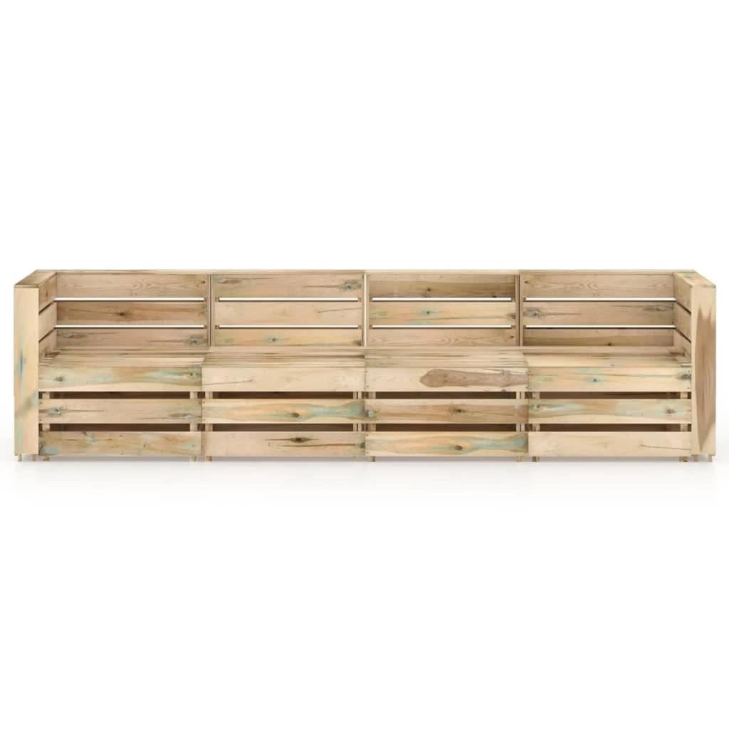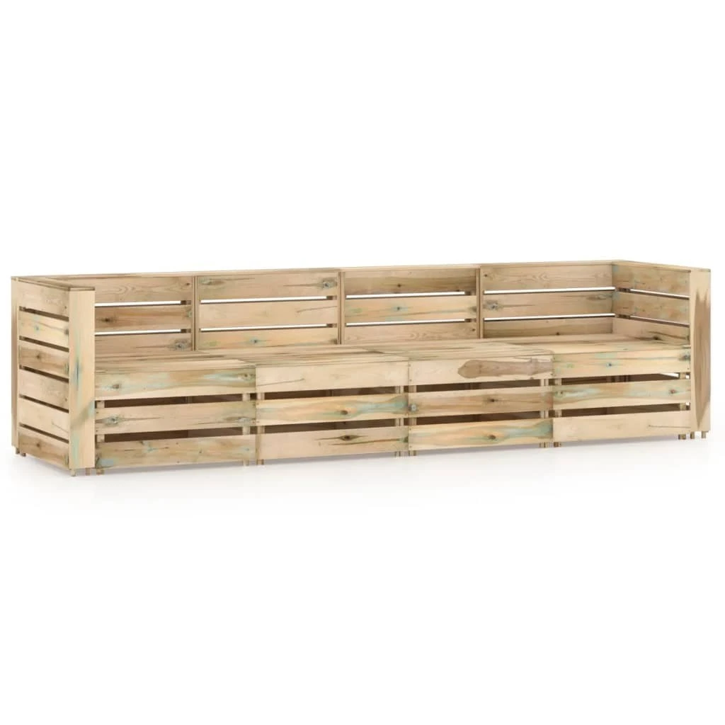 Este sofá de jardín de 4 plazas es una opción ideal para relajarte y disfrutar del buen tiempo, echar una siesta o charlar con tu familia o amigos. Con un diseño de palés atemporal, el sofá de madera agregará un toque de encanto rústico a tu patio, jardín o sala de estar. Hecho de madera de pino impregnada, el sofá de palet es duradero, resistente a la intemperie y respetuoso con el medio ambiente. Este sofá de jardín macizo y requiere poco mantenimiento. Nota: Para prolongar la vida útil de los muebles de exterior, te recomendamos que los limpies con regularidad y no los dejes al aire libre sin protección innecesariamente.Limpieza: Usa una solución de jabón suave.Almacenamiento: Si es posible, guarda el producto en un lugar fresco y seco en el interior. Si el producto se almacena al aire libre, protégelo con una funda impermeable. Limpia y seca el exceso de agua o nieve de las superficies planas después de una lluvia o nevada. Permite la ventilación para evitar daños relacionados con la humedad. Material: Madera de pino verde impregnadaDimensiones de sofá esquinero: 69 x 70 x 66 cm (ancho x profundo x altoDimensiones del sofá central: 60 x 70 x 66 cm (ancho x profundo x altoRequiere montaje: SíLa entrega incluye:2 x Sofás centrales2 x Sofás de esquina